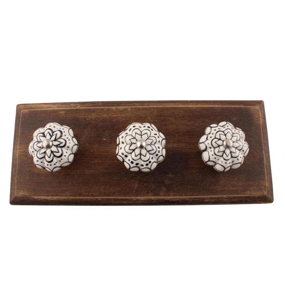 Black Flower Ceramic Wooden Hook. A Perfect Complement to the Soft Tone of the Wood are these White Traditional Hat and Coat Hook Made of Genuine Porcelain and Brass. It can be used to Hang Jewelry, Leashes, Towels, Scarves, Light Weight Sweaters, Caps etc.