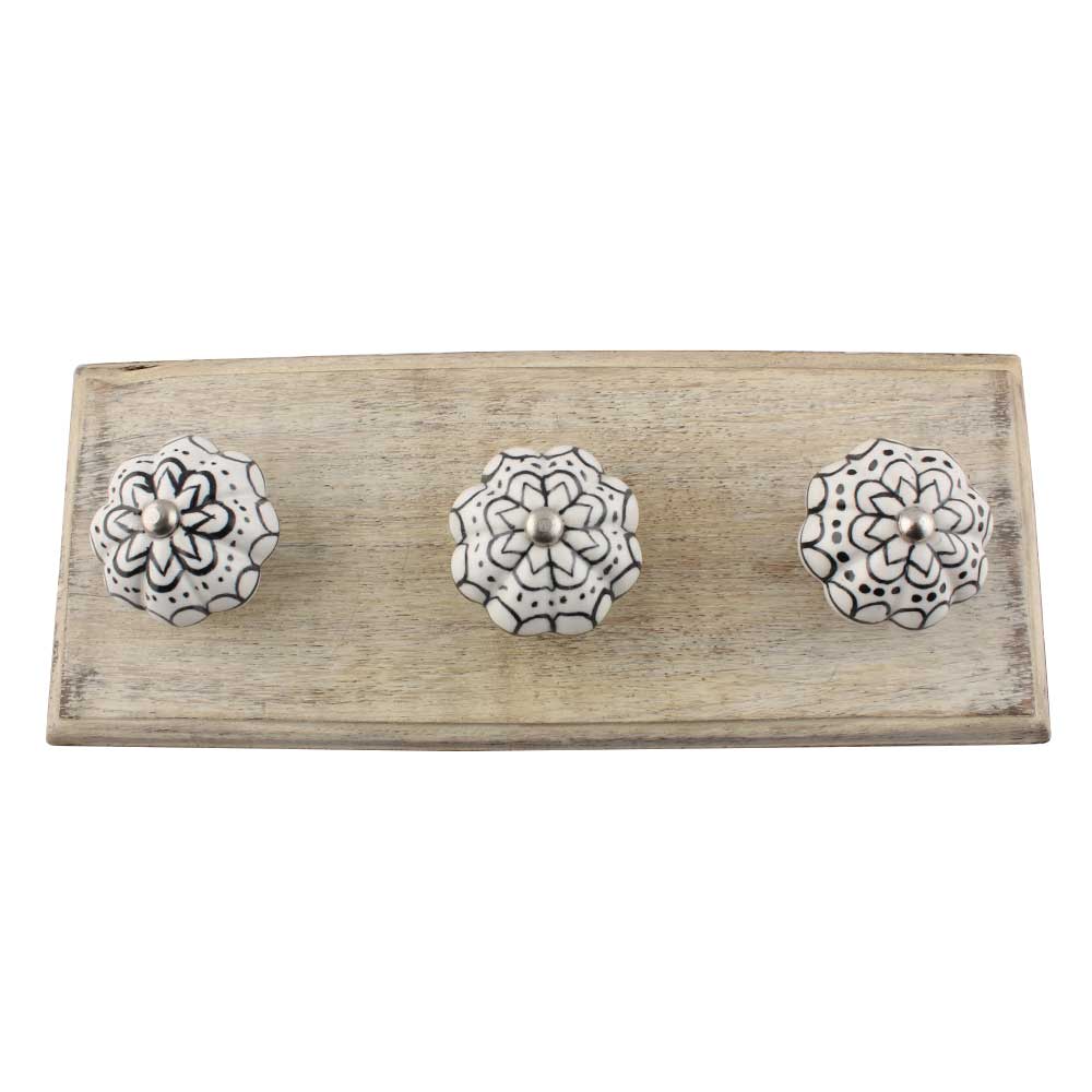 Black Flower Ceramic Wooden Hook. A Perfect Complement to the Soft Tone of the Wood are these White Traditional Hat and Coat Hook Made of Genuine Porcelain and Brass. It can be used to Hang Jewelry, Leashes, Towels, Scarves, Light Weight Sweaters, Caps etc.