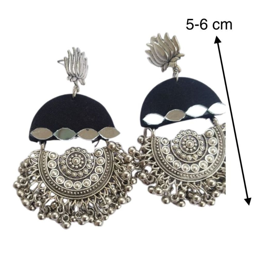 These Black Heavy Oxidized Jhumka Earrings blend the sophistication of deep black fabric with the artistry of oxidized silver detailing. Designed in a timeless jhumka silhouette, they offer a striking contrast that elevates both everyday ethnic wear and festive outfits. Lightweight yet statement-worthy, this pair brings a modern edge to traditional handcrafted jewelry.