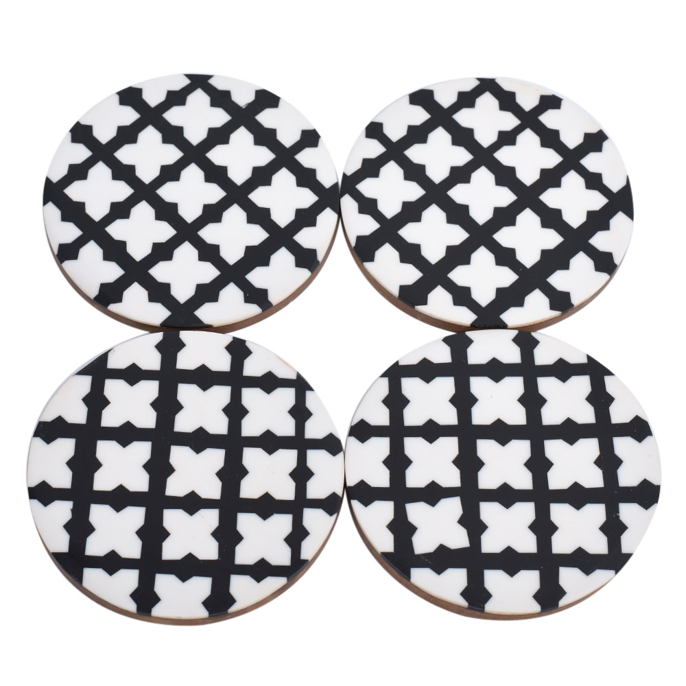 The Moroccan design wood and resin coaster set of four is intended to elevate any dining experience at home, whether it is an informal or formal dinner arrangement with friends. Place glasses and bottles on the coaster to avoid leaving watermarks, stains, or spills on your table top. The classic black and white coaster set of four with a wooden undersurface would also make an excellent housewarming gift.
