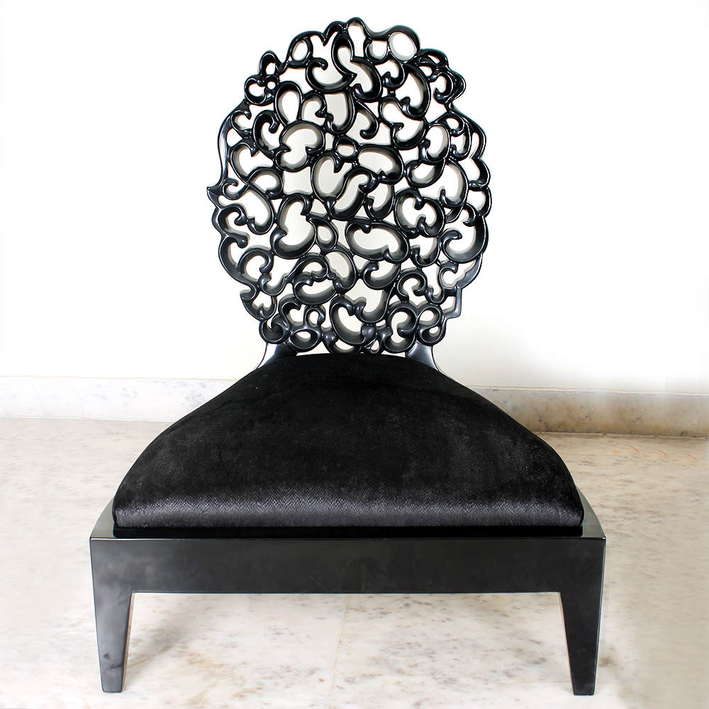 Stunning low height wooden chairs in semi-gloss PU finish with an intricately carved back. Small cushions accentuate beauty of the pieces and provides a lumber support to the user for utmost comfort .