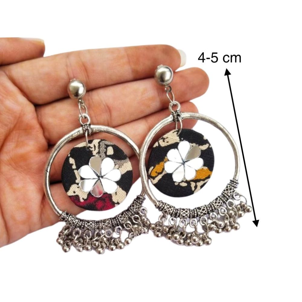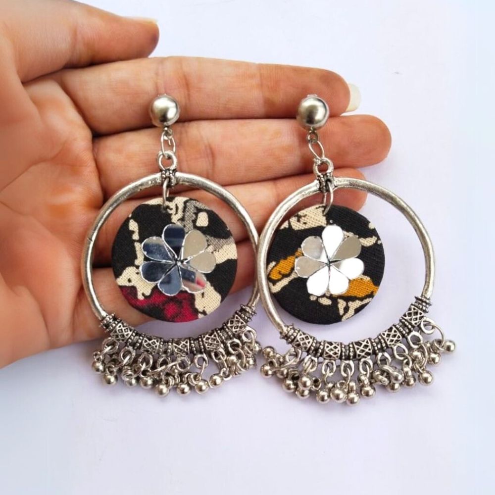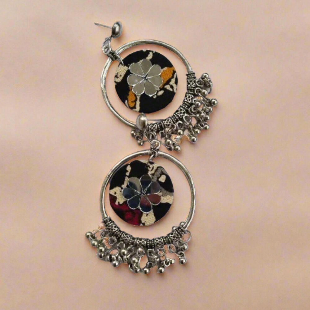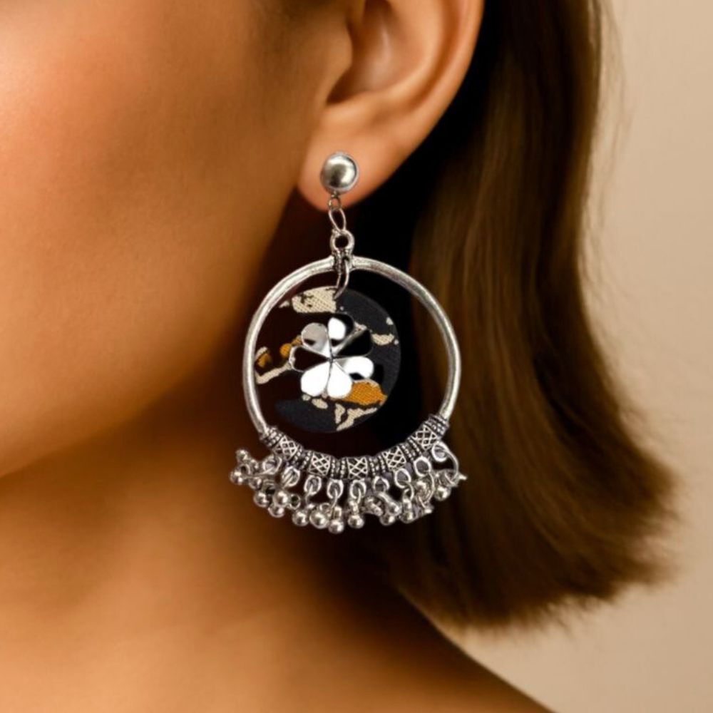 These Black Printed Bali Jhumka Earrings with Ghungroo beautifully blend classic Indian craftsmanship with contemporary printed fabric. The bali-style hoop paired with a traditional jhumka dome offers a graceful silhouette that moves elegantly with every step. Finished with delicate ghungroo accents, this pair adds rhythm, charm, and cultural richness to your look.