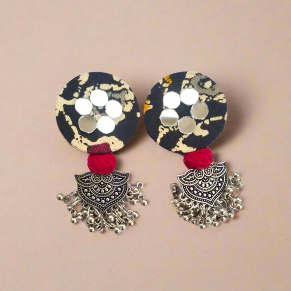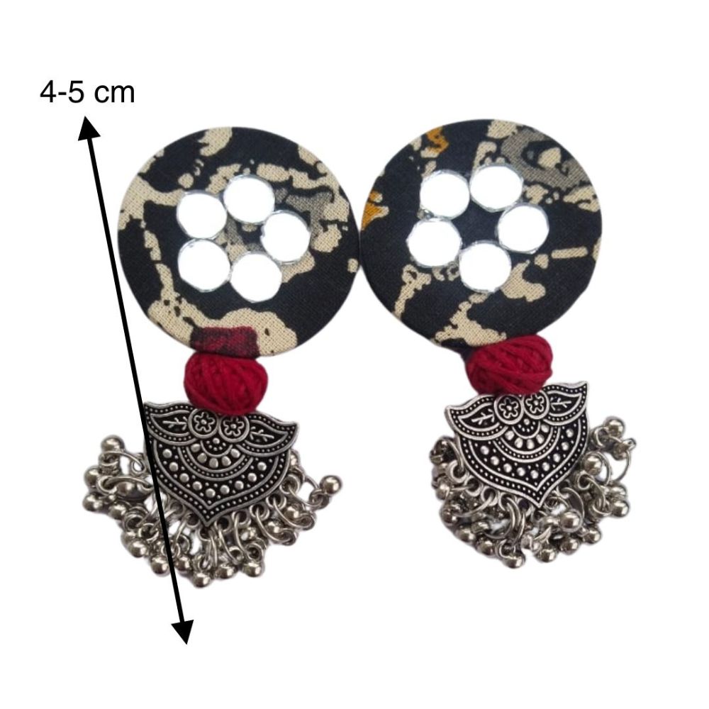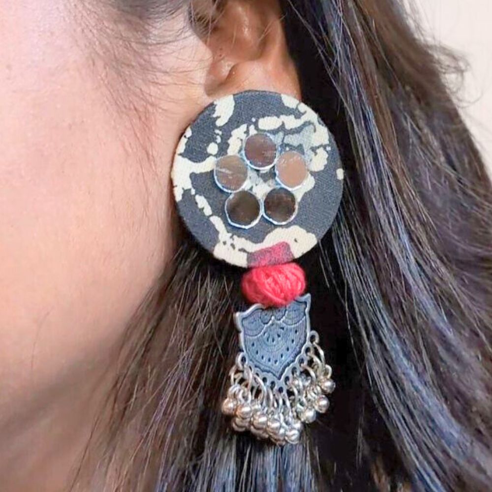 Style these earrings with monochrome outfits, handloom sarees, or solid kurtas, and store them separately to protect the fabric print and silver finish.