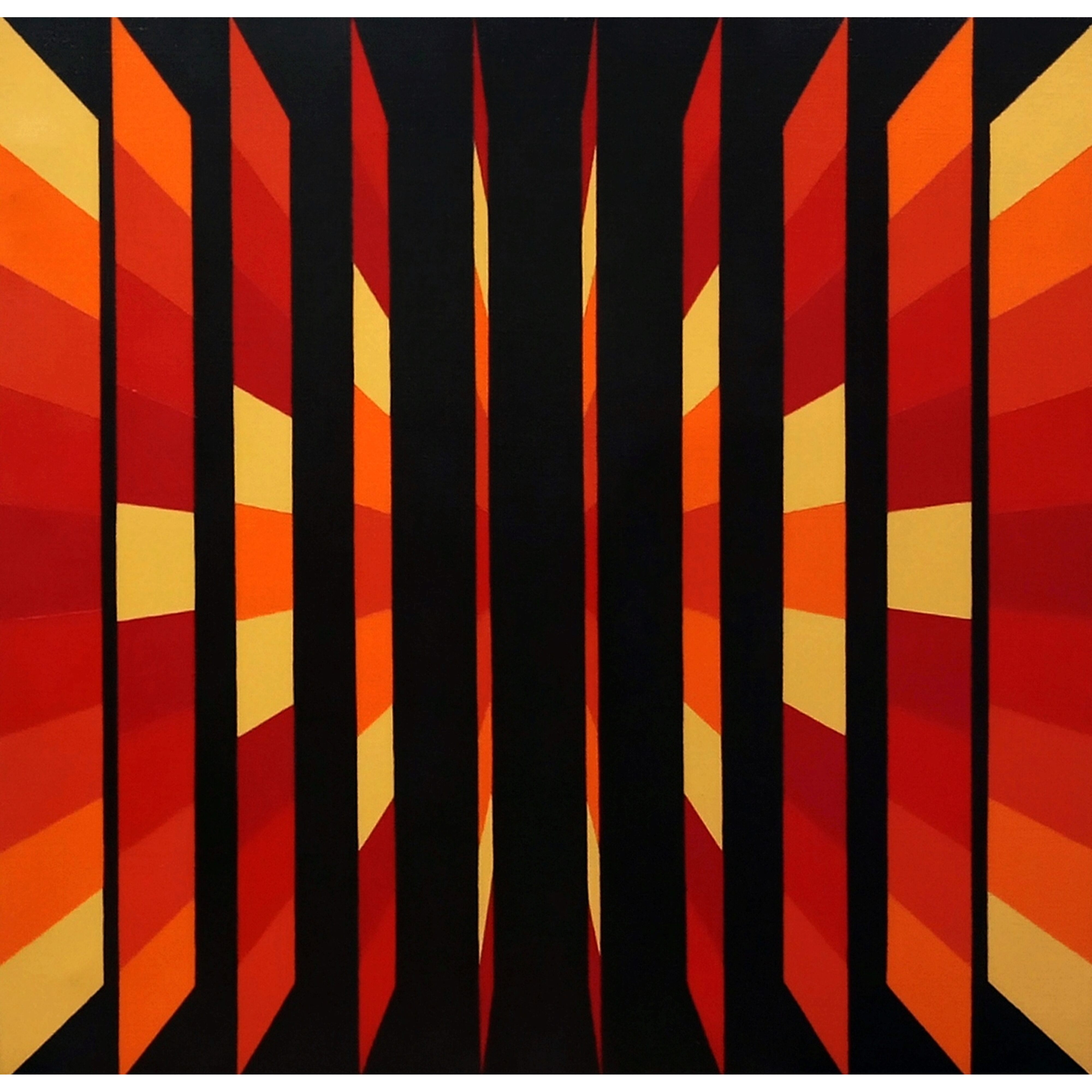 "Bloom" is a bold acrylic on canvas that radiates with fiery intensity and architectural rhythm. Vertical columns of black frame radiant bursts of red, orange, and yellow, resembling petals unfurling or light piercing through darkness. The symmetrical repetition creates a tunnel-like illusion, drawing the viewer inward while evoking a powerful sense of expansion. With its warm, sunset-inspired palette and stark contrasts, "Bloom" captures the duality of containment and release. The artwork explores the idea of emergence—of energy blooming from within structure—inviting viewers to reflect on transformation, focus, and the radiant strength hidden within controlled form.