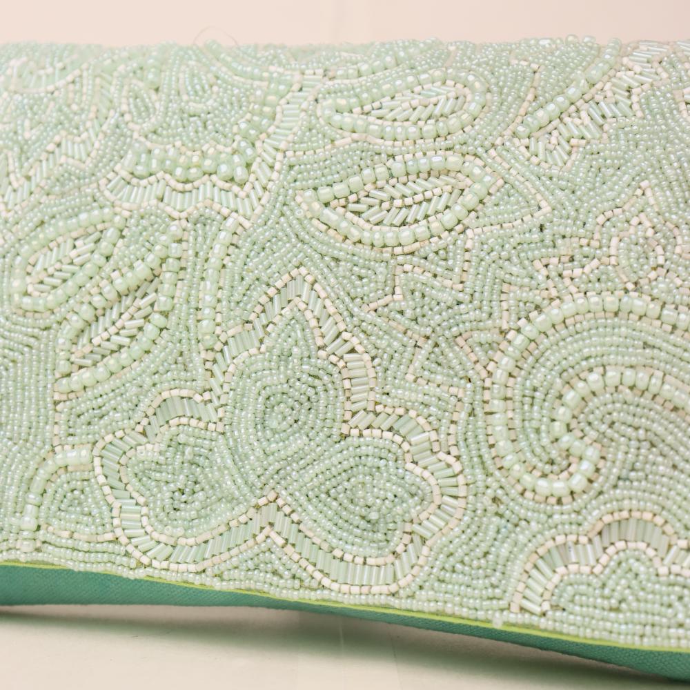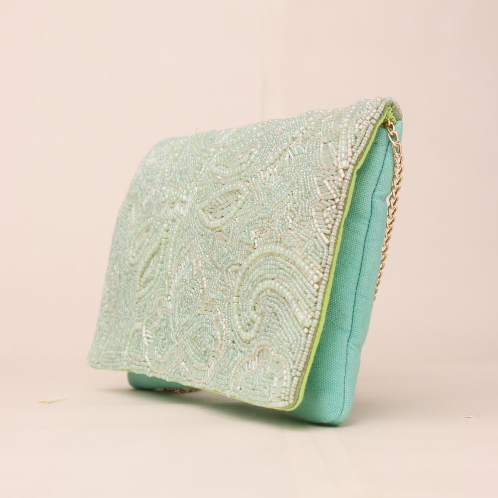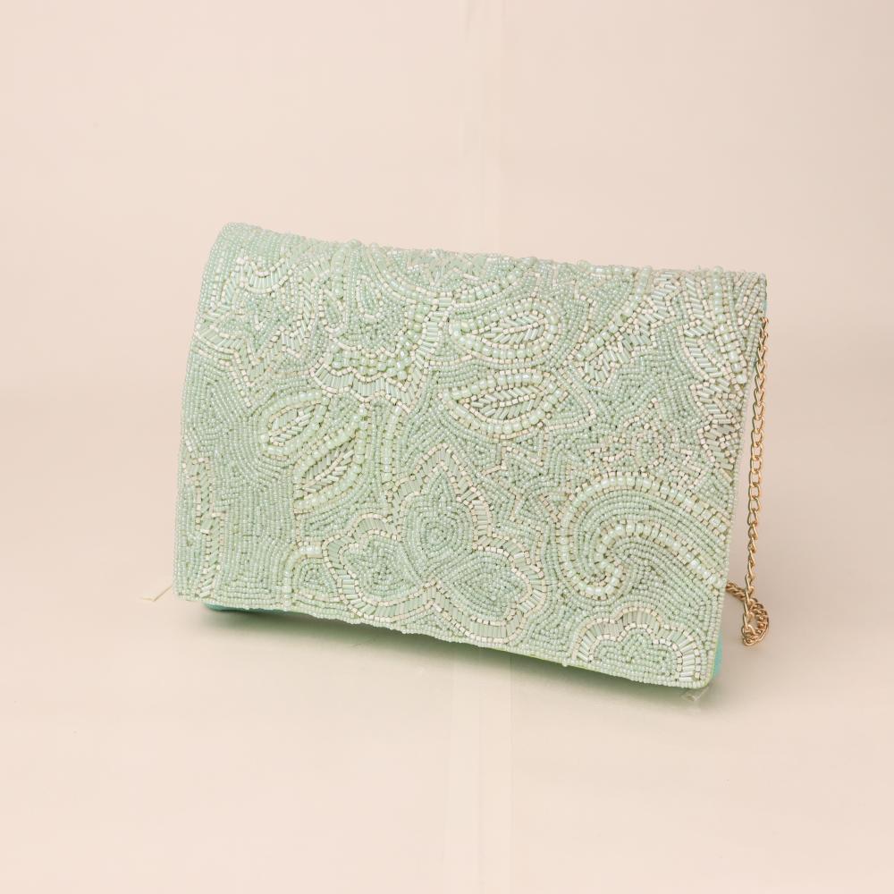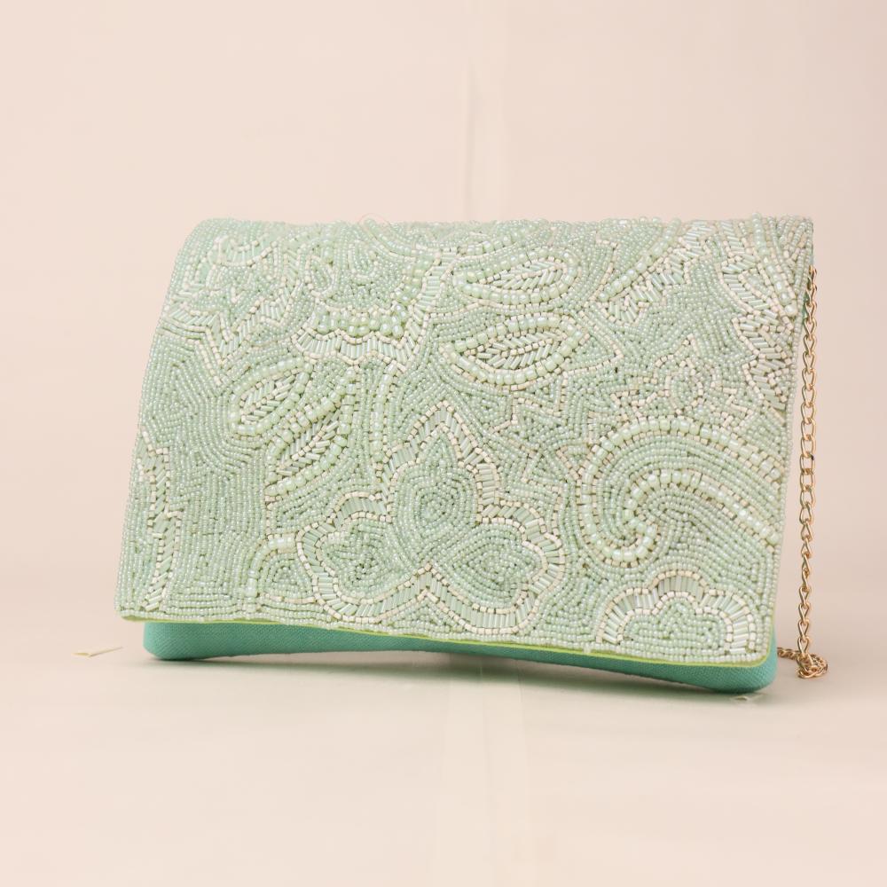 A delicate dance of embroidery and sparkle, this hand-embellished clutch radiates timeless elegance. Intricately detailed with symmetrical floral patterns and subtle shimmer, it's designed to complement both minimalist outfits and festive attire. The sleek chain strap adds functional sophistication, letting you carry it with grace from day events to evening affairs.