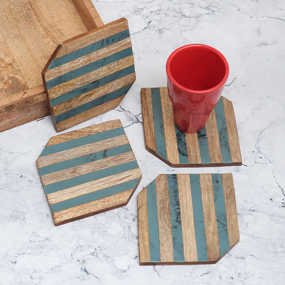 Buy a wooden coaster set online and get a hassle free delivery at your doorstep. Crafted with utmost precision and care, this Pack of four coasters is a testament to the artistry of skilled Indian artisans. Each coaster is handcrafted from high-quality wood, ensuring durability and longevity. Designed with a unique hexagonal shape, these coasters feature a stunning brown and blue coloured pattern, complemented by an antique finish. Not only do they serve as practical accessories to hold water, tea, juice, or coffee glasses, but they also double as captivating decorative pieces for your home or office. The best wooden coaster set on the market, this masterpiece prevents unsightly stains on your surfaces, effortlessly combining functionality and aesthetics. Ideal for use in homes, offices, restaurants, hotels, or cafes, it adds a touch of sophistication to any setting. These versatile coasters also make for a thoughtful gift for your near and dear on special or festive occasions, showcasing your impeccable taste and consideration.