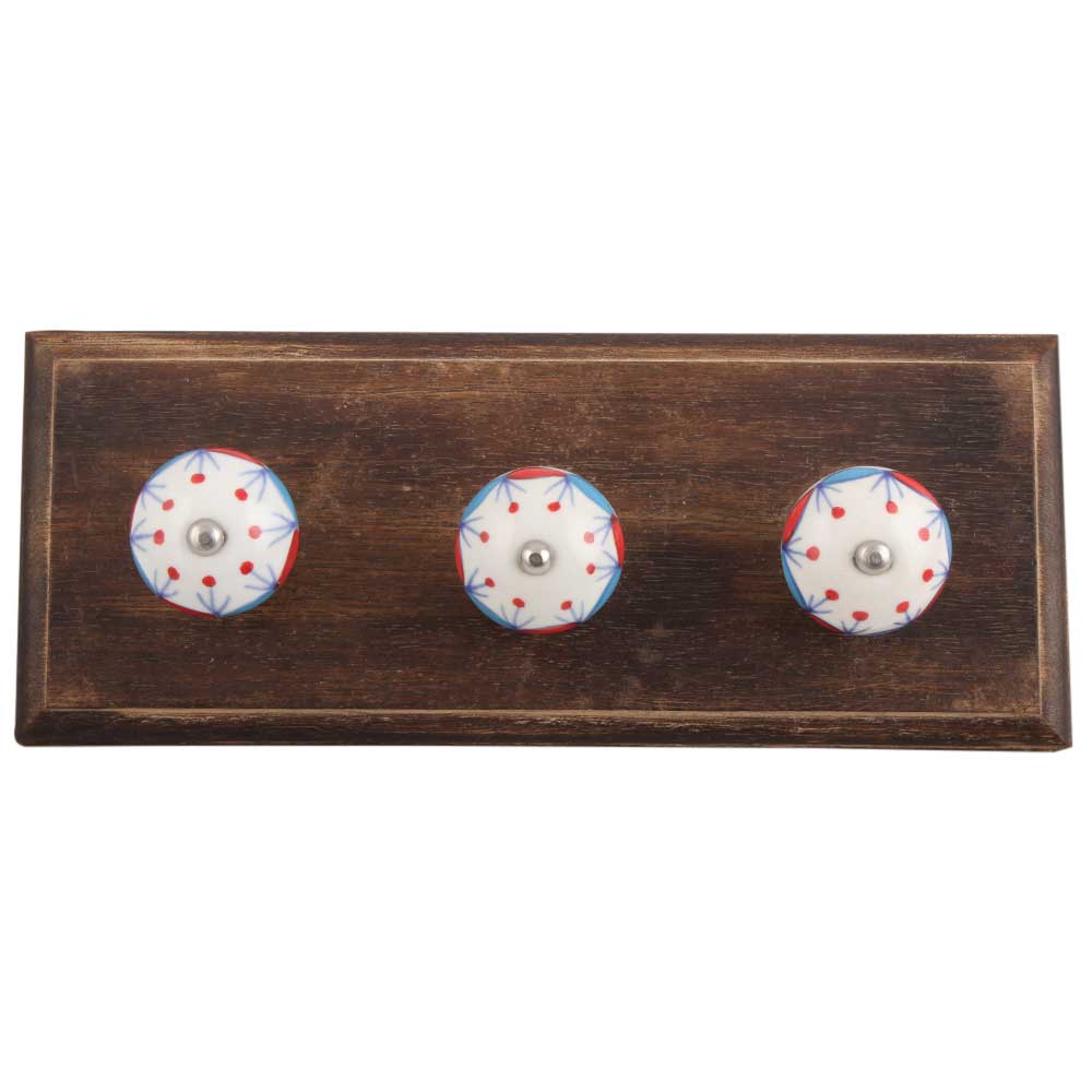 Blue and Red Design Ceramic Wooden Hook. A Perfect Complement to the Soft Tone of the Wood are these White Traditional Hat & Coat Hook Made of Genuine Porcelain and Brass. It can be use to Hang Jewellery, Leashes, Towels, Scarves, Light Weight Sweaters, Caps Etc.