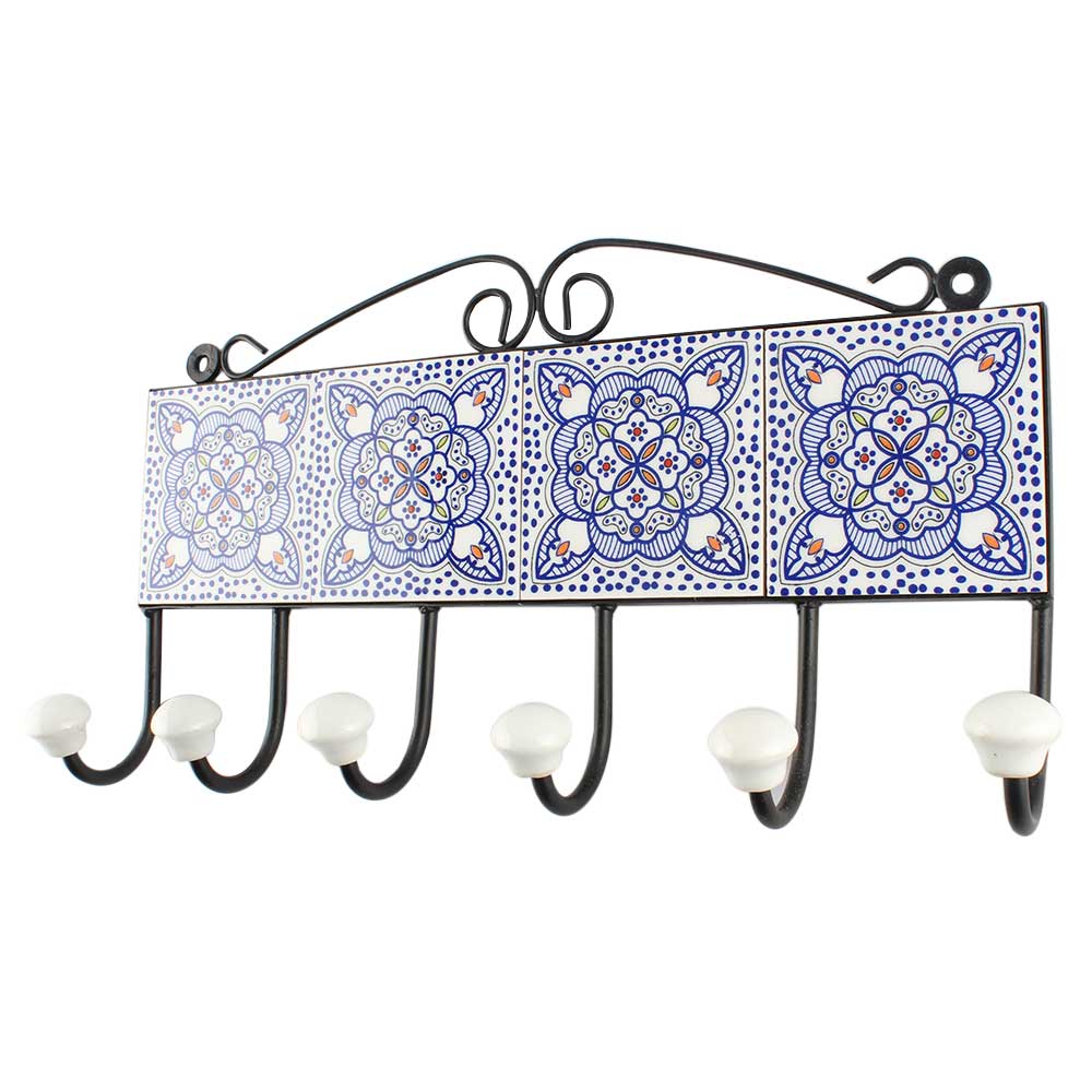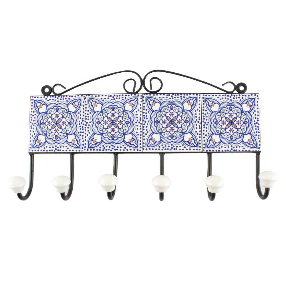 Blue And White Ceramic Floral Tile Hook. When Put on Wall or Cabinet It is An Art in Itself. The Metal Part of this Hook is Black Powder Coated.