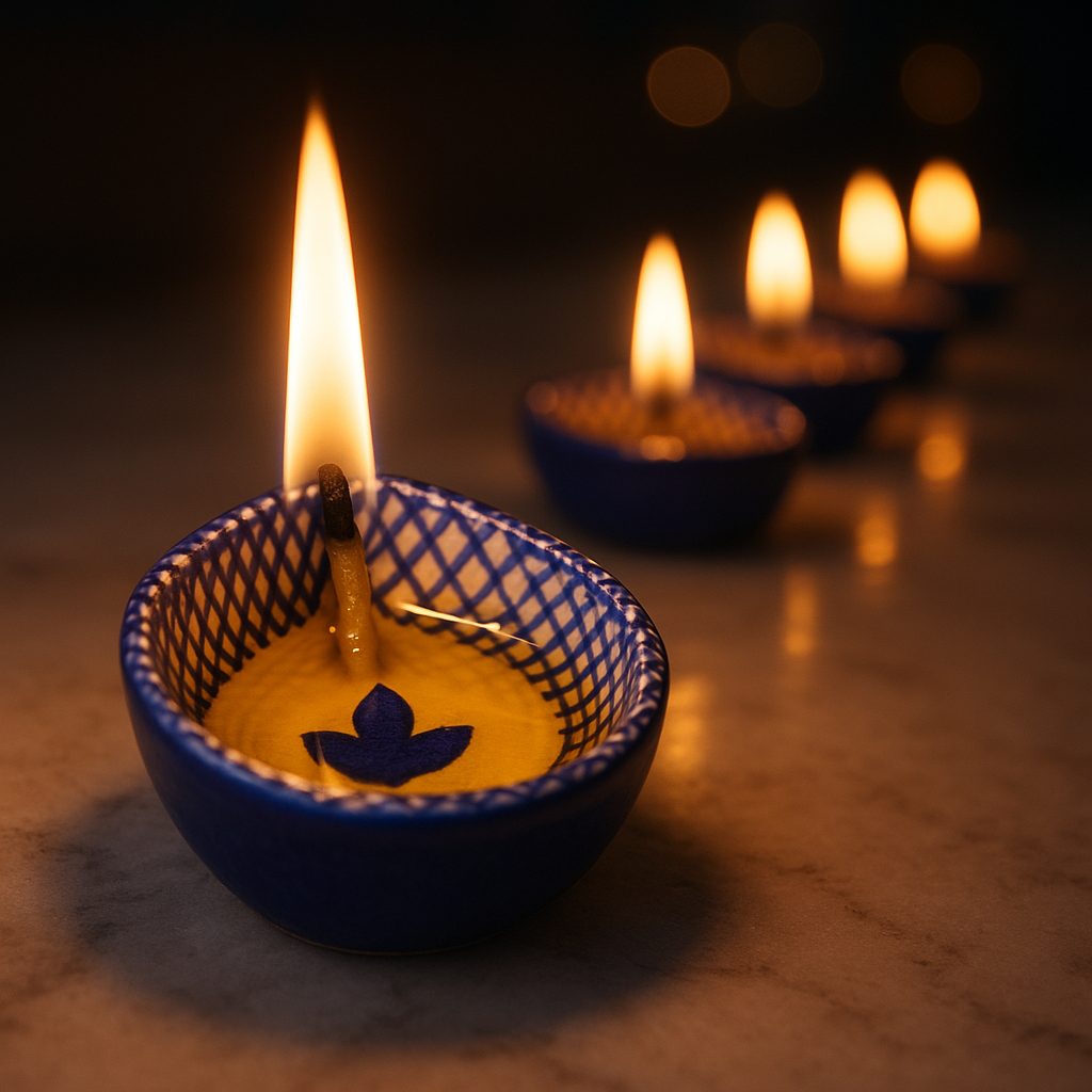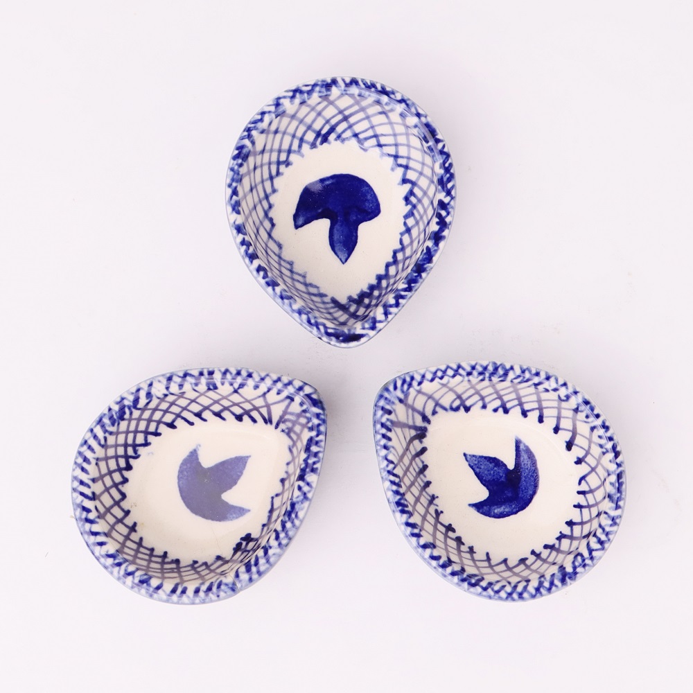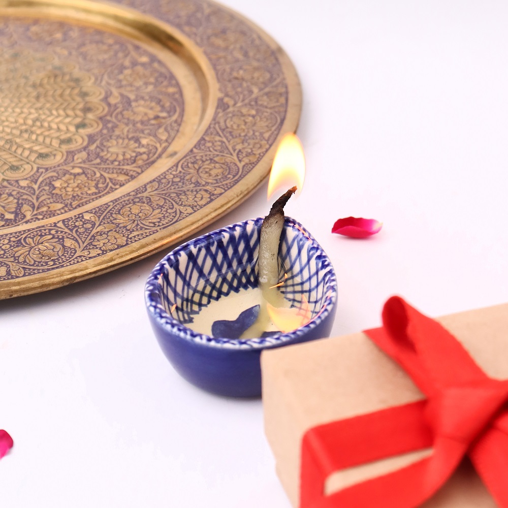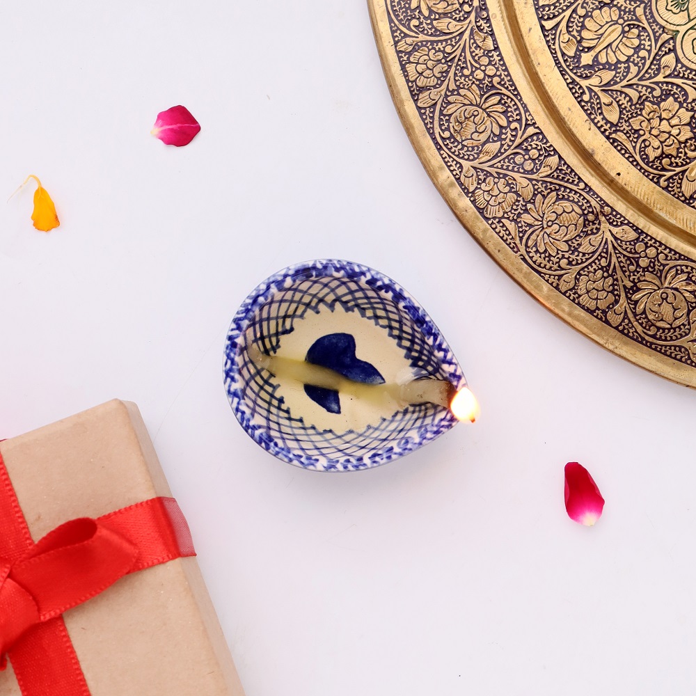 Celebrate the festival of lights with this blue and white design ceramic Diwali diya, beautifully crafted to bring elegance and devotion into your sacred space. Its smooth ceramic base is adorned with hand-painted blue patterns that stand out against the white glaze, creating a classic contrast. Compact in size yet rich in symbolism, this diya is perfect for temple decoration, festive rituals, or as a decorative accent for modern homes. Each piece carries the touch of skilled artisans who keep India’s traditional ceramic craft alive.