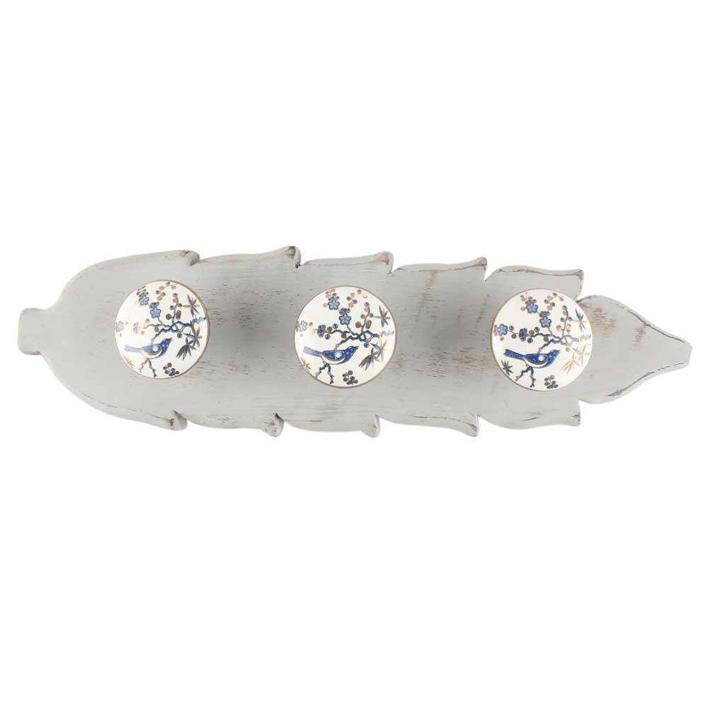 Blue Bird Golden Berry Ceramic Floral Hook in Grey Wood. A Perfect Complement to the Soft Tone of the Wood are these White Traditional Hat and Coat Hook Made of Genuine Porcelain. It can be use to Hang Jewellery, Leashes, Towels, Scarves, Light Weight Sweaters, Caps etc.
