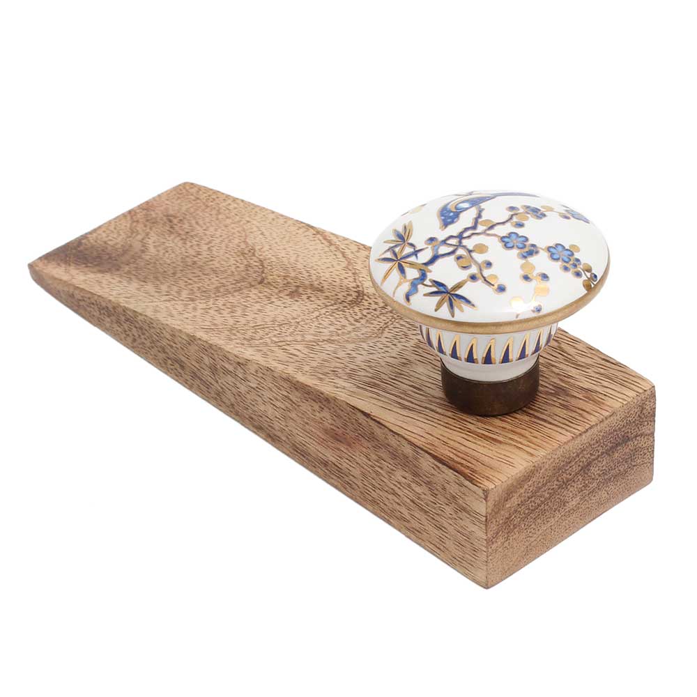 The Blue Bird Golden Berry Ceramic Floral Wooden Door Stopper is a versatile decorative accessory that works well in various rooms. Whether you use it to prop open doors in a cozy living room, an inviting bedroom, or a warm entryway, its bright design adds character and personality wherever it’s placed.