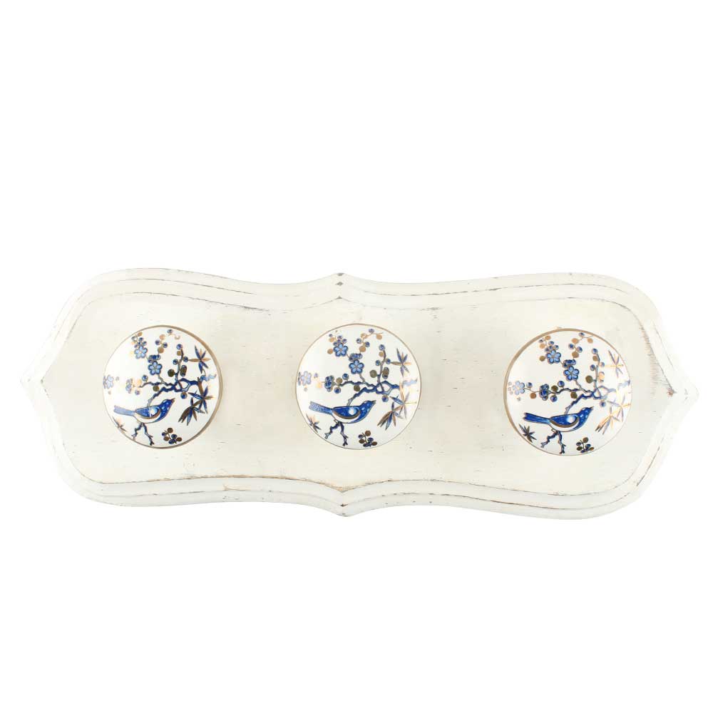 Blue Bird Golden Berry Ceramic Wooden Hook in White Painted. A Perfect Complement to the Soft Tone of the Wood are these White Traditional Hat and Coat Hook Made of Genuine Porcelain. It can be use to Hang Jewellery, Leashes, Towels, Scarves, Light Weight Sweaters, Caps etc.