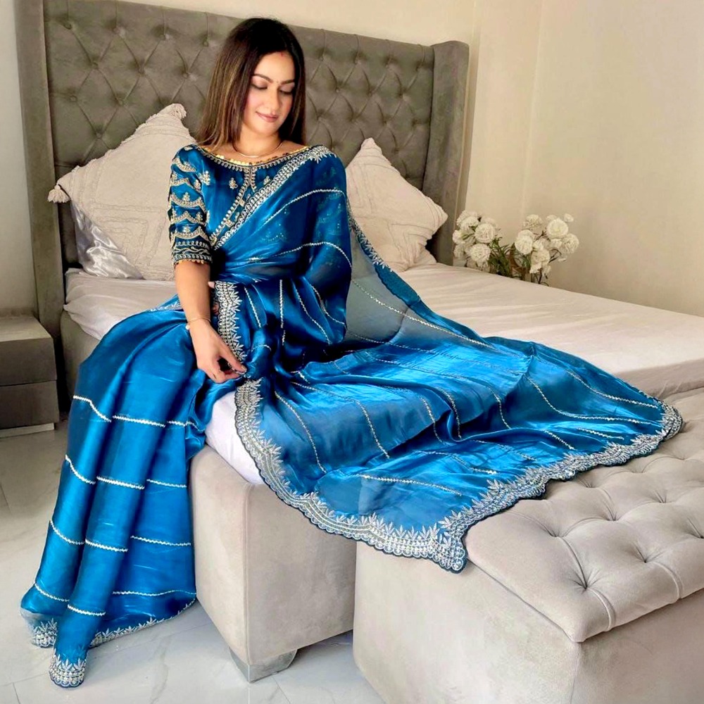Step into elegance with this captivating Bridal Bollywood-style saree in pure organza silk, drenched in a brilliant royal blue hue. Delicately lightweight yet rich in appearance, this saree features fine silver diagonal embroidery that sparkles with every graceful movement. The highlight lies in its intricately handworked scalloped silver zari border, adding heritage-inspired charm to a modern silhouette. The soft translucency of organza creates an ethereal drape, while the smooth silk base ensures luxurious comfort for long wedding celebrations or special festive occasions. Whether styled for an engagement, bridal photoshoot, or high-end reception, this saree reflects timeless beauty and elevated glamour. Match it with an embroidered blouse and kundan jewelry for an unforgettable look.