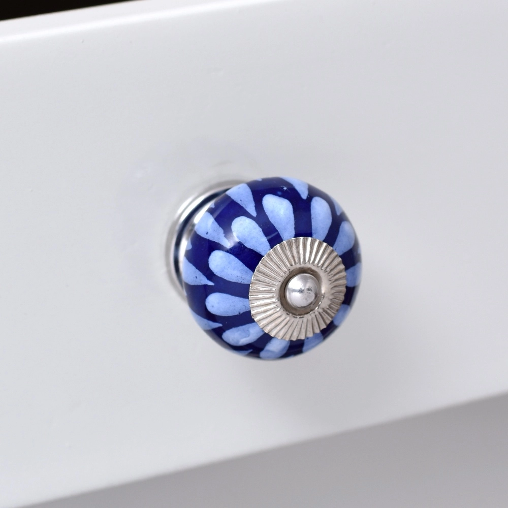 Enhance the aesthetic of your furniture with our exquisite Ceramic Round Knob in blue finish. This stunning knob is not just a functional piece but also a work of art, handcrafted by skilled Indian artisans who have honed their craft for generations. The intricate floral design adds a touch of elegance and charm to any drawer, dresser, cabinet, wardrobe, cupboard, or almirah. Our Ceramic knob is the epitome of luxury and craftsmanship, making it the perfect choice for both residential and commercial spaces. It's not just handles for cabinets and drawers, it's a statement of your impeccable taste. Whether you're looking to upgrade your kitchen handles for cabinets or add a touch of opulence to your office, hotel, cafe, or shop, this knob is the ideal choice. Moreover, it's an ideal gift for your loved ones on special or festive occasions. Show them you care by gifting them a piece of Indian craftsmanship that exudes beauty and sophistication.