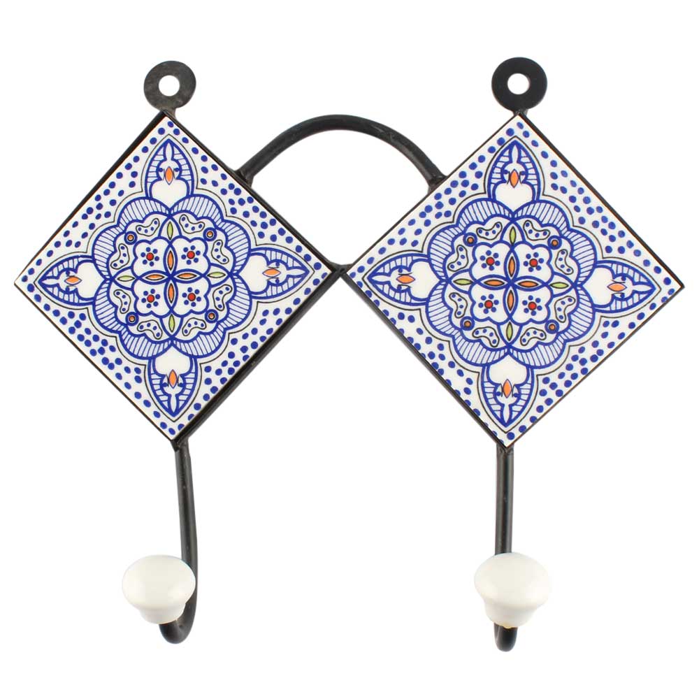 Blue Ceramic Floral Tile Hook. When Put on Wall or Cabinet It is An Art in Itself. The Metal Part of this Hook is Black Powder Coated.