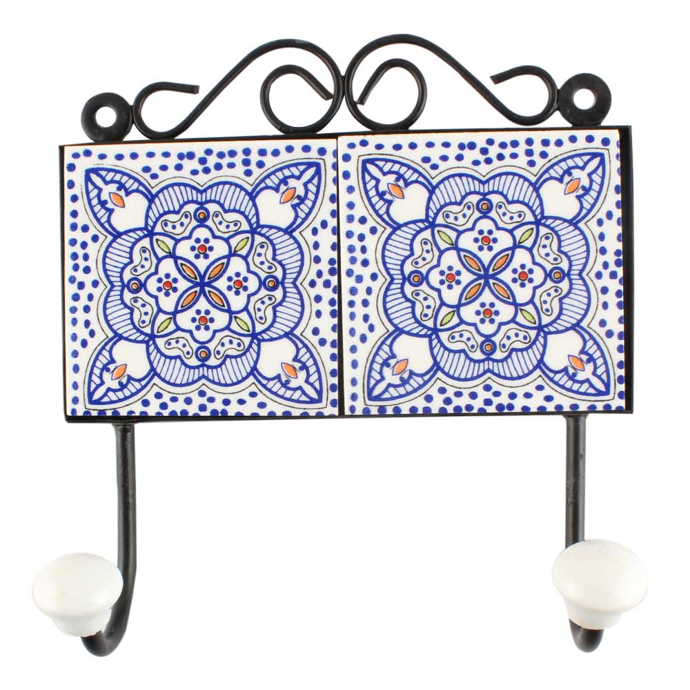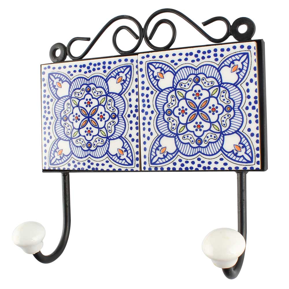 Blue Ceramic Floral Tile Hook. When Put on Wall or Cabinet It is An Art in Itself. The Metal Part of this Hook is Black Powder Coated.