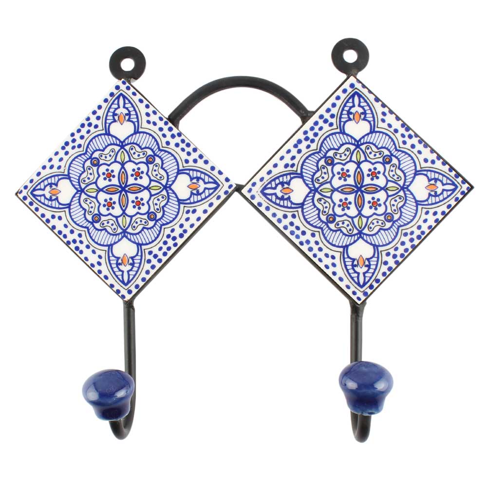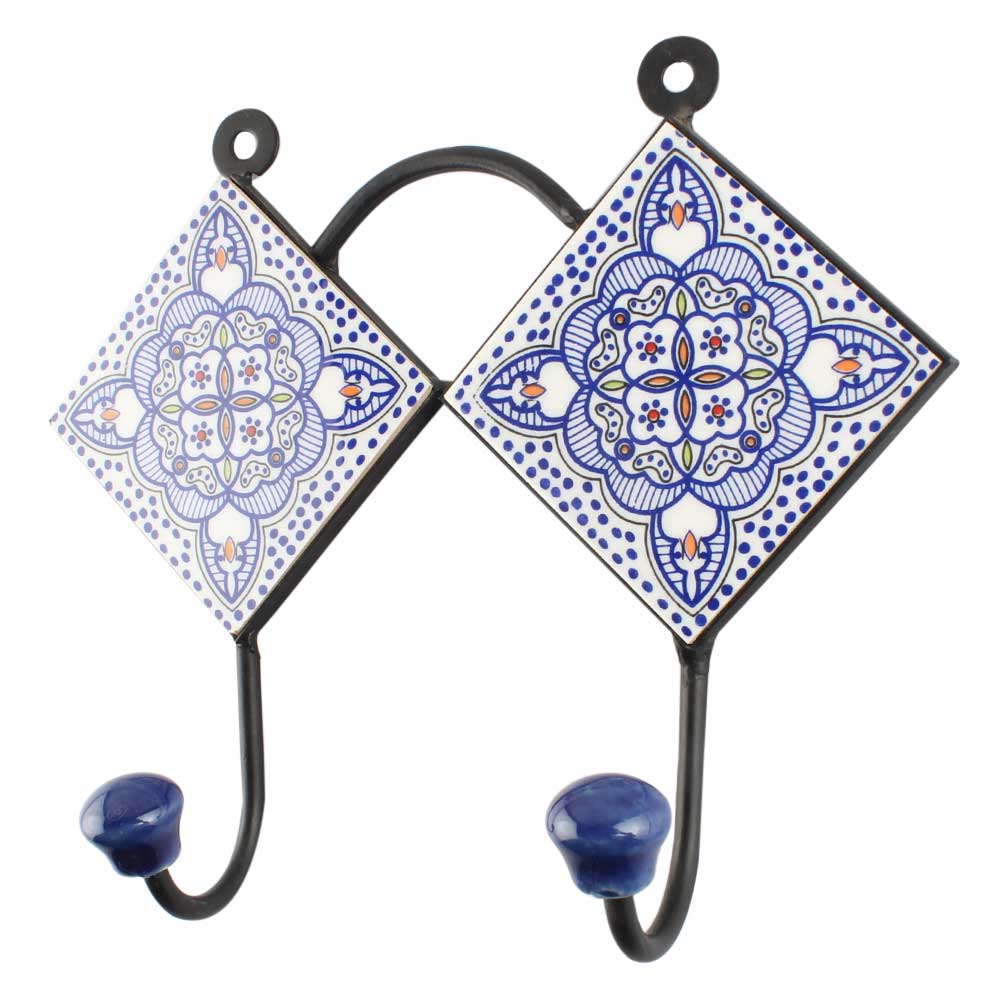 Blue Ceramic Floral Tile Hook. When Put on Wall or Cabinet It is An Art in Itself. The Metal Part of this Hook is Black Powder Coated.