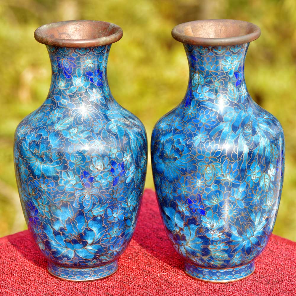 Decorative enameled metal ware called cloisonné exhibit almost superhuman skill by master craftsmen displayed by the marvelous diversity, intricacy and beauty of their designs. Earliest decorative motifs include cloud patterns, lotus flowers, the symbol of purity and beauty later motifs included dragons amid clouds, floral landscapes, scenes from court and mystical animals. Exquisitely detailed petals and leaves with fine color gradations. Fine inlaid wirework at neck and base, which are edged in brass. Exquisitely detailed petals and leaves with fine color gradations. Dark cobalt blue ground with white, rust, orange, yellow, and mauve blossoms; foliage in shades of green edged in rust are some of the popular designs of cloisonné.