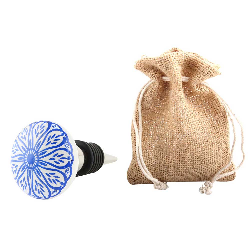 Blue Daisy Flat Ceramic Wine Bottle Stopper. Zinc Alloy Wine Bottle Stopper with Attractive Jute Bag Packaging.