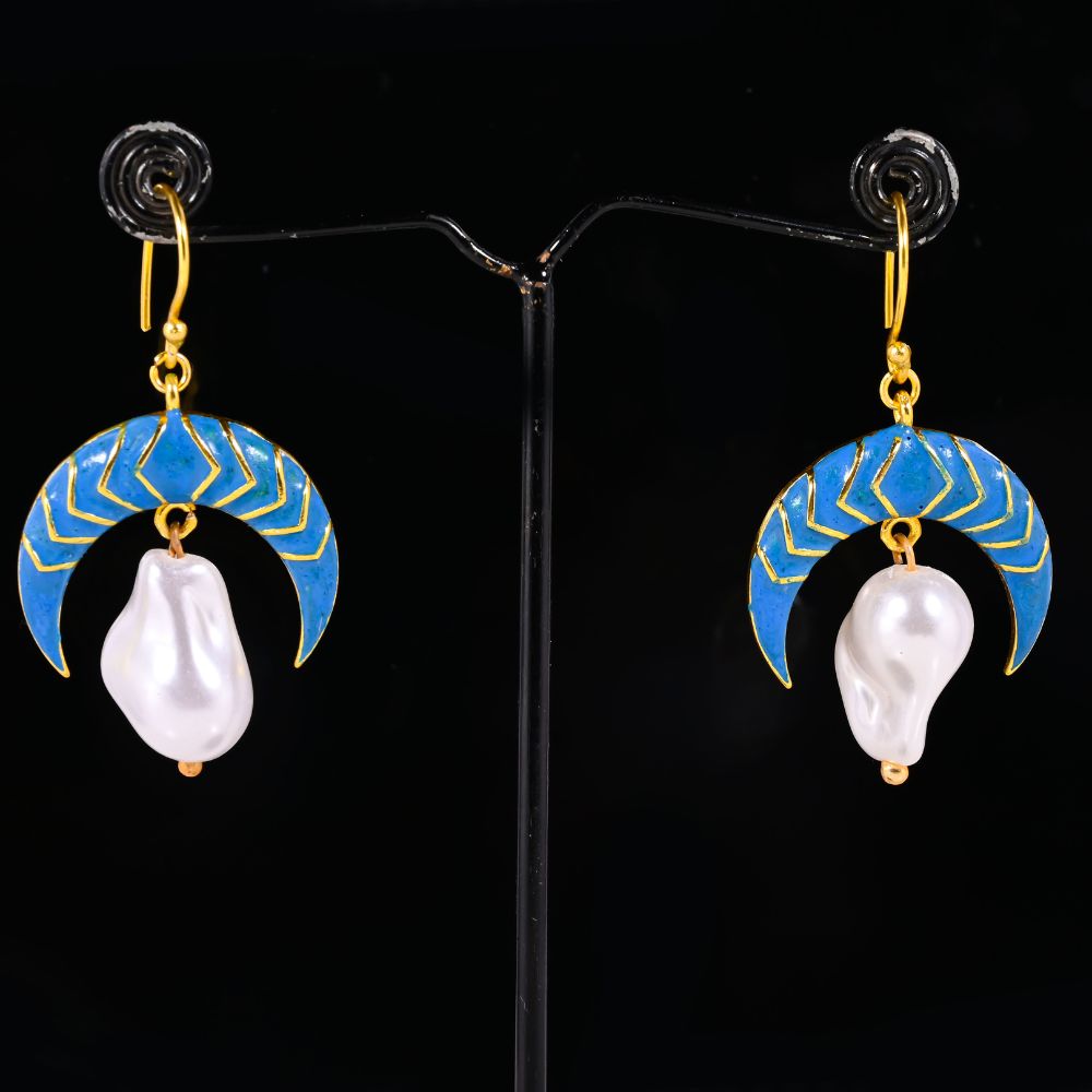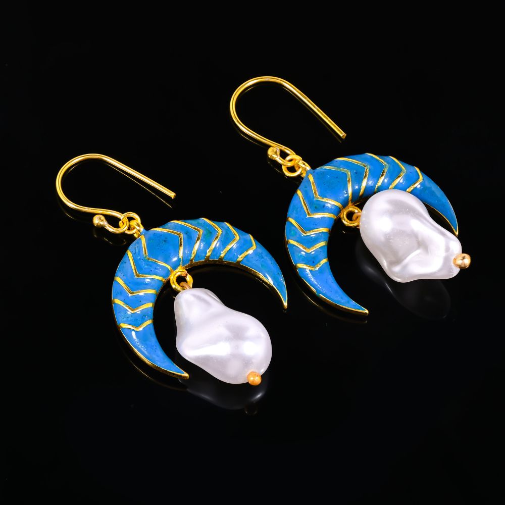 The Blue Enamel and Pearl Crescent Moon Dangle Earrings for Women blend celestial symbolism with refined artisan craftsmanship. Crafted in brass and finished with rich 22K gold plating, the crescent moon silhouette is highlighted by deep blue enamel and softened with delicate pearl accents. The gentle dangle adds fluid movement, creating a look that feels poetic yet polished. Designed to be lightweight and expressive, these earrings elevate both festive and everyday elegance.
