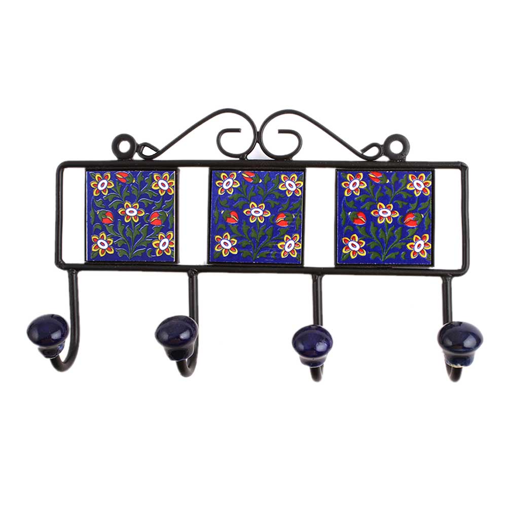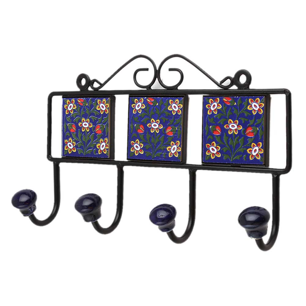 Blue Floral Ceramic Tiles Hooks. When put on wall or cabinet it is an art in itself. The metal part of this hook is black powder coated.
