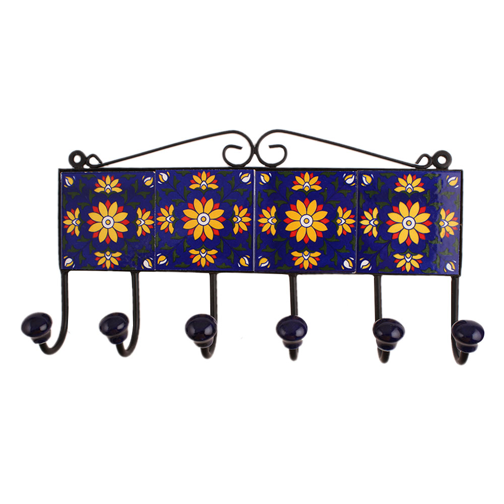 Blue Floral Ceramic Tiles Hooks. When put on wall or cabinet it is an art in itself. The metal part of this hook is black powder coated.