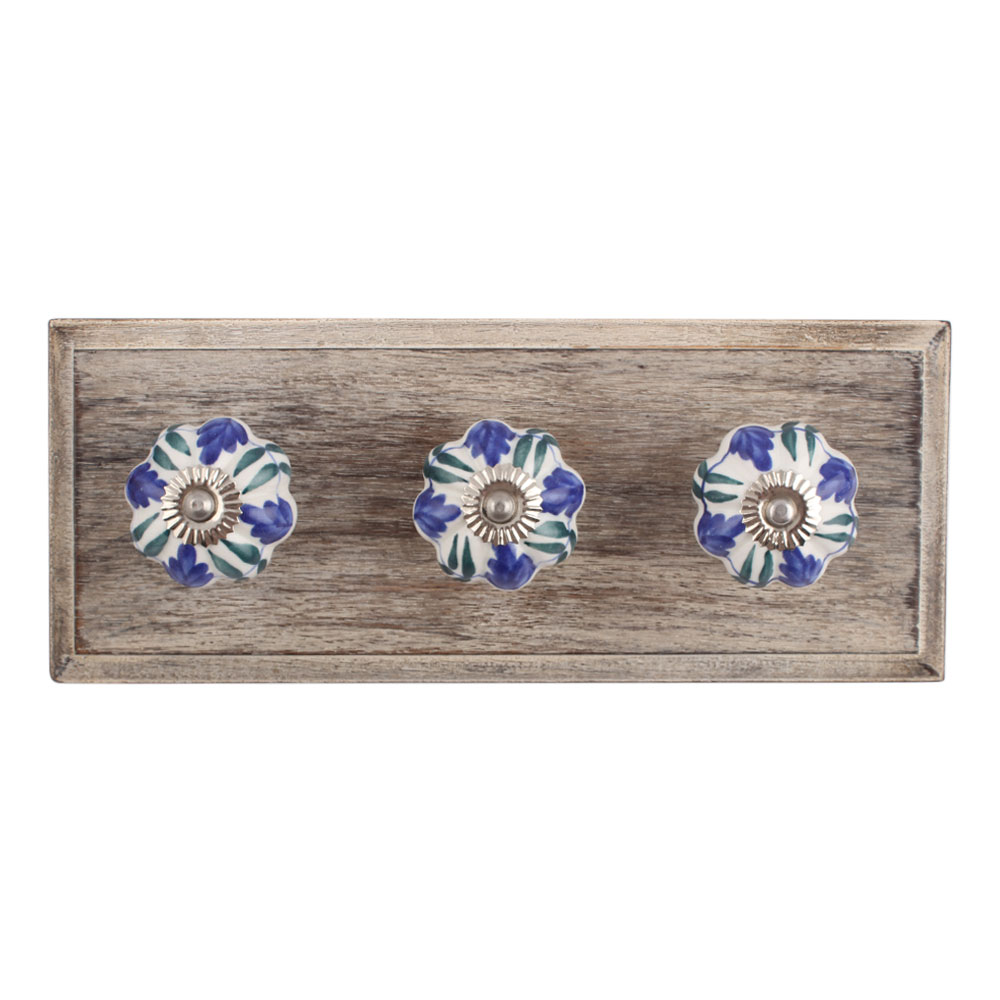 Blue Floral Ceramic Wooden Hook. A Perfect Complement to the Soft Tone of the Wood are these White Traditional Hat & Coat Hook Made of Genuine Porcelain and Brass. It can be use to Hang Jewellery, Leashes, Towels, Scarves, Light Weight Sweaters, Caps Etc.