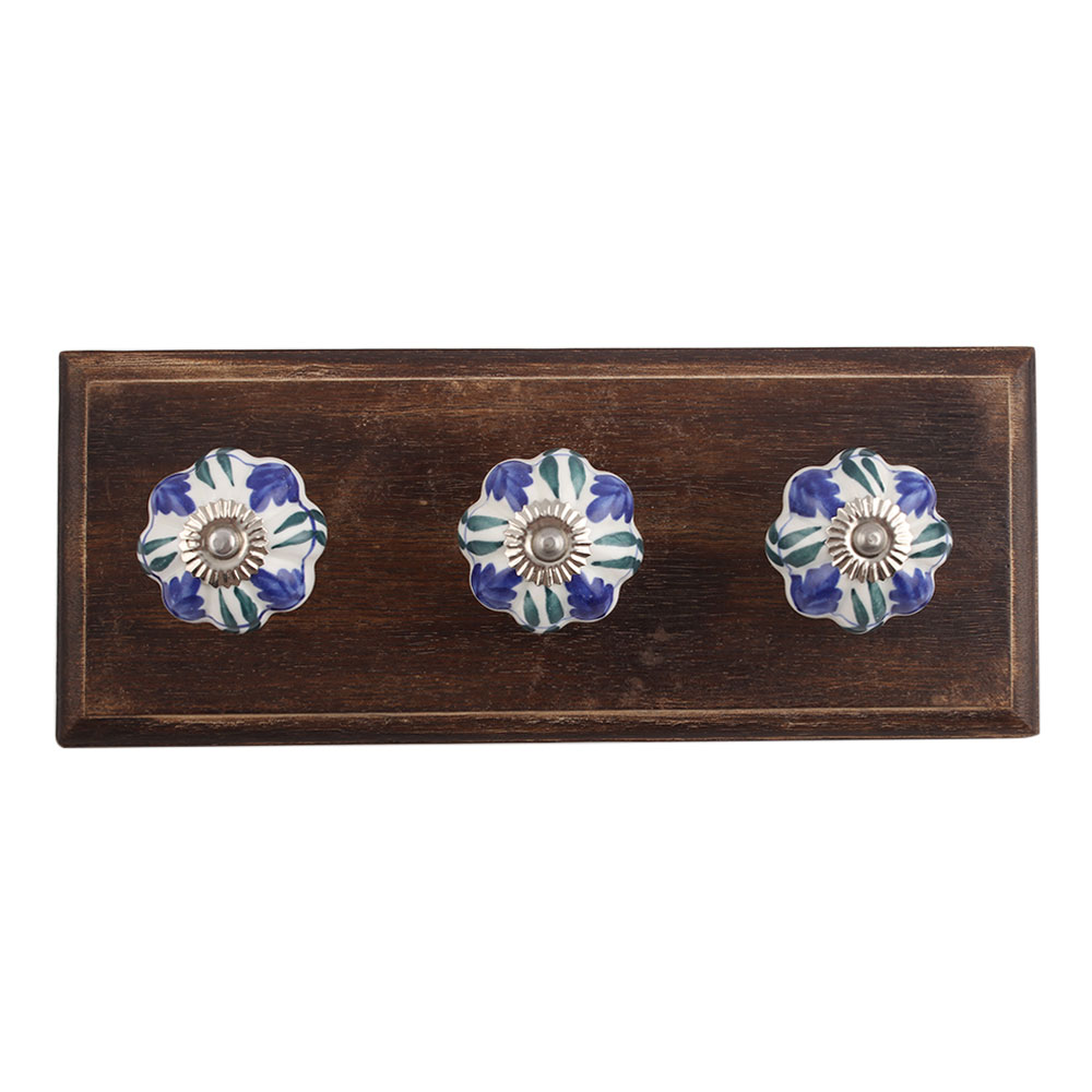 Blue Floral Ceramic Wooden Hook. A Perfect Complement to the Soft Tone of the Wood are these White Traditional Hat & Coat Hook Made of Genuine Porcelain and Brass. It can be use to Hang Jewellery, Leashes, Towels, Scarves, Light Weight Sweaters, Caps Etc.