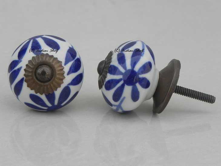 Blue Floral Leaf Ceramic Knob. Ideal for kitchen cabinets, kitchen drawers, dining room, bed room, chest drawers, dressing tables, almirah