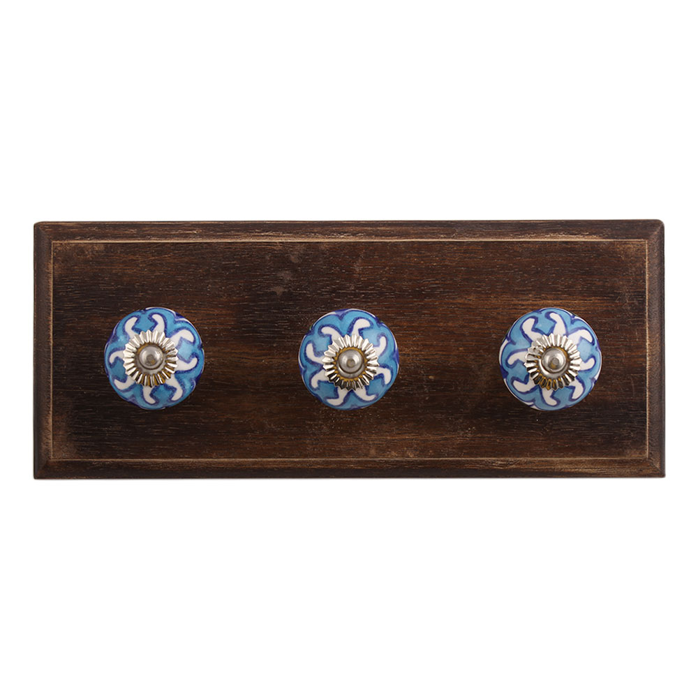 Blue Flower Ceramic Wooden Hook. A Perfect Complement to the Soft Tone of the Wood are these White Traditional Hat & Coat Hook Made of Genuine Porcelain and Brass. It can be use to Hang Jewellery, Leashes, Towels, Scarves, Light Weight Sweaters, Caps Etc.