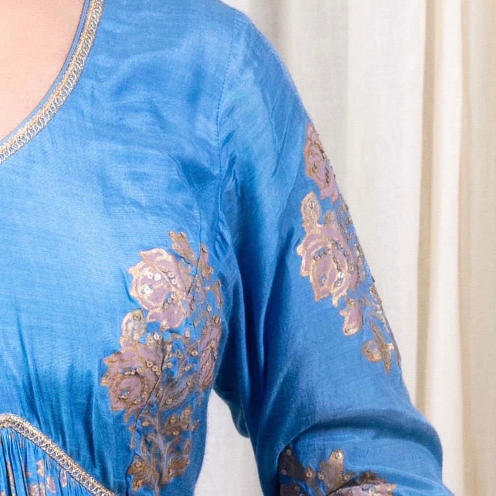 Grace every occasion with timeless elegance in this Blue Gathered Anarkali Set, beautifully crafted in soft muslin fabric and adorned with intricate hand block prints and delicate hand embroidery. The Anarkali features a flattering V-neckline and three-quarter sleeves embellished with elegant threadwork that adds a refined touch to the ensemble. The gathered flare provides a regal flow and a comfortable fit, making it perfect for long celebrations or formal events. Paired with a breathable cotton bottom for added comfort, this set blends traditional design with modern wearability. The look is completed with a luxurious viscose organza dupatta, accented with printed and embroidered borders that elevate its grace. The rich blue hue and gold accents make this outfit ideal for festive evenings, wedding functions, or cultural celebrations. Radiating craftsmanship and sophistication, this handcrafted Anarkali set is a wardrobe essential for those who value style, tradition, and fine detailing.