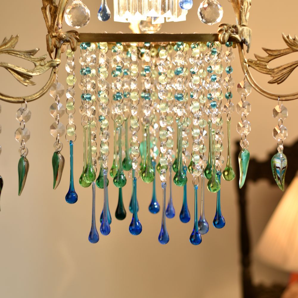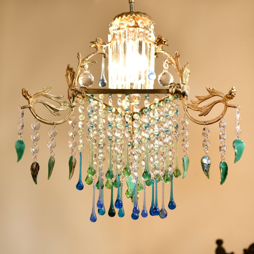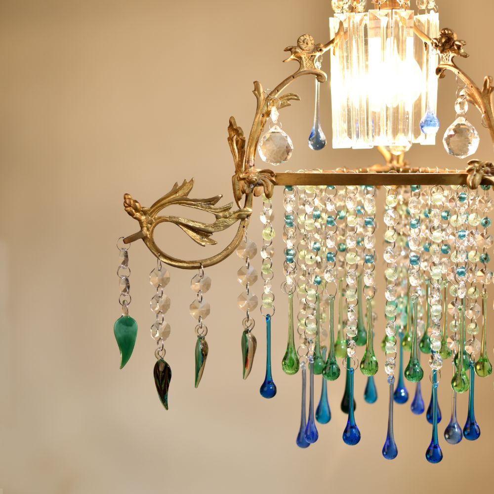 A premium-quality brass and glass chandelier that is a masterpiece of elegance and sophistication. Crafted with precision and attention to detail, this stunning fixture combines the richness of brass with the delicacy of glass to create a timeless piece of art that adds a touch of grandeur to any space. Inside the gracefully designed brass frame, a radiant bulb illuminates the surroundings, casting a warm and inviting glow. The charm of this chandelier lies not only in its brilliant illumination but also in the captivating crystal clear finish of its hangings. The crystal-clear accents bring a sense of transparency and purity, while the green and blue-coloured hangings introduce a subtle yet enchanting splash of colour, adding a mesmerizing contrast to the overall design. This chandelier is a versatile statement piece that complements various settings, making it perfect for your home, restaurant, hotel, or cafe decoration. Its dazzling appearance instantly transforms any space into a luxurious haven, leaving a lasting impression on all who behold it. With an adorable and eye-catching design, this chandelier becomes an awe-inspiring focal point, drawing attention and admiration from all angles. It is not only a magnificent addition to your decor but also a thoughtful and meaningful gift for your family, friends or relatives on special, festive, or auspicious occasions, conveying your affection and appreciation in a memorable way.