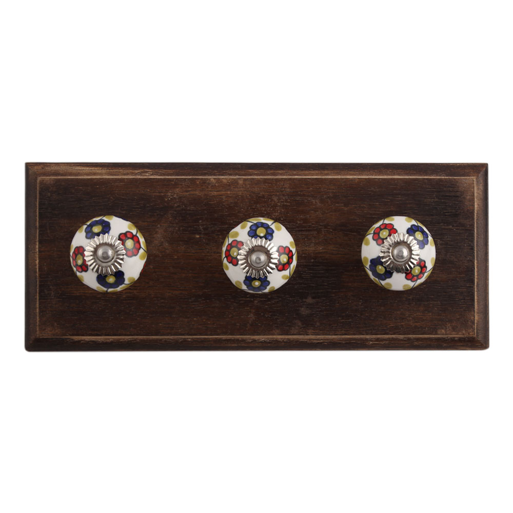 Blue Red Sunflower Ceramic Wooden Hook. A Perfect Complement to the Soft Tone of the Wood are these White Traditional Hat & Coat Hook Made of Genuine Porcelain and Brass. It can be use to Hang Jewellery, Leashes, Towels, Scarves, Light Weight Sweaters, Caps Etc.