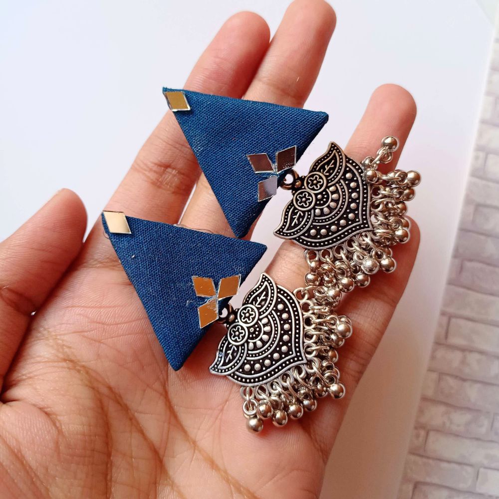 The Blue Triangular Jhumka Earrings with Silver Charm bring a refreshing geometric twist to a timeless Indian silhouette. Crafted on a fabric base, the triangular form introduces structure and balance, while the calming blue tone adds depth and elegance. Finished with silver-toned jhumka charms, the earrings move gently, creating a subtle play of sound and shimmer. Designed to be expressive yet comfortable, they suit both festive moments and everyday ethnic styling.