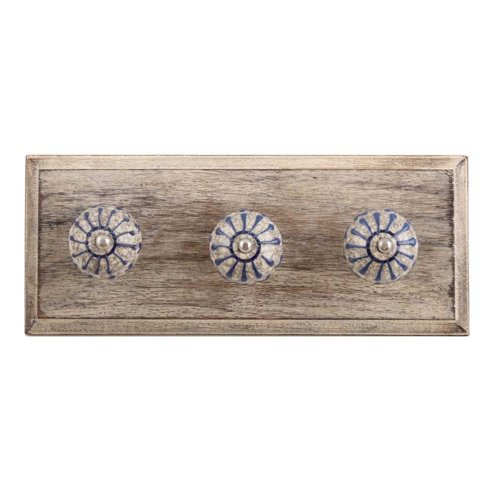 Blue Wheel Crackle Ceramic Wooden Hook. A Perfect Complement to the Soft Tone of the Wood are these White Traditional Hat and Coat Hook Made of Genuine Porcelain and Brass. It can be used to Hang Jewelry, Leashes, Towels, Scarves, Light Weight Sweaters, Caps etc.