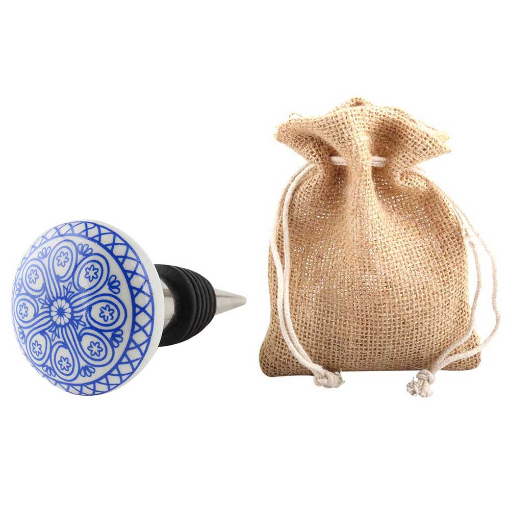 Blue Wheel Flat Ceramic Wine Bottle Stopper. Zinc Alloy Wine Bottle Stopper with Attractive Jute Bag Packaging.