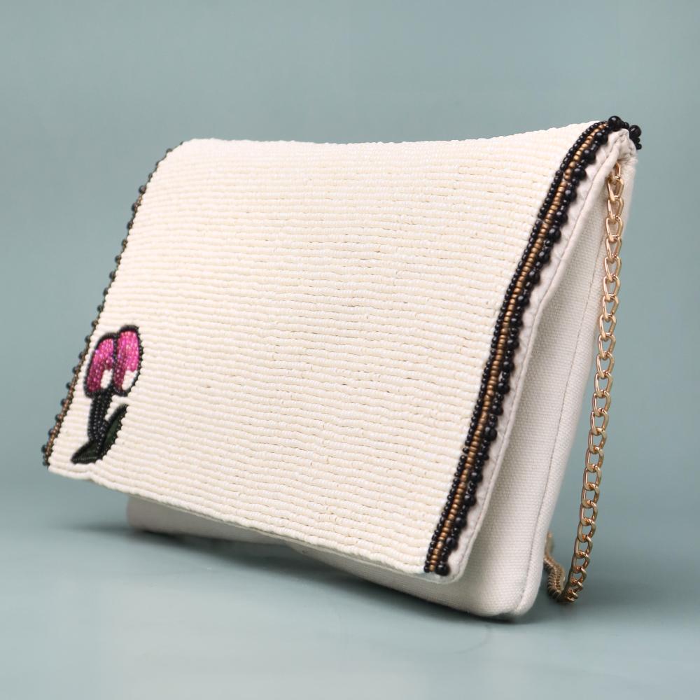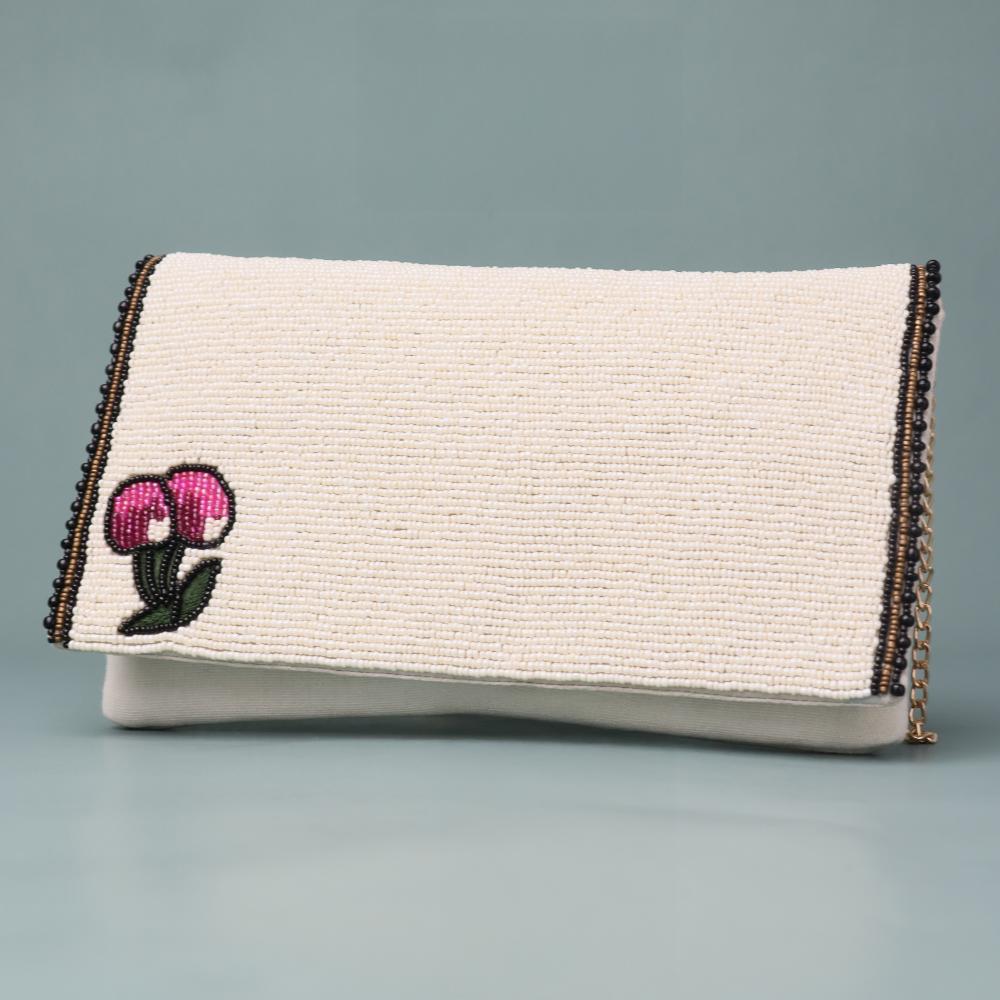 Delicate and charming, the Blush Bloom Beaded Clutch is a minimalist statement piece for the modern woman. Featuring intricate ivory beadwork on a soft fabric base, the clutch is beautifully accented with a petite pink flower motif in one corner—an ode to subtle elegance. The sleek silhouette is complemented by a gold-tone chain strap, offering versatile wear as a clutch or a crossbody.