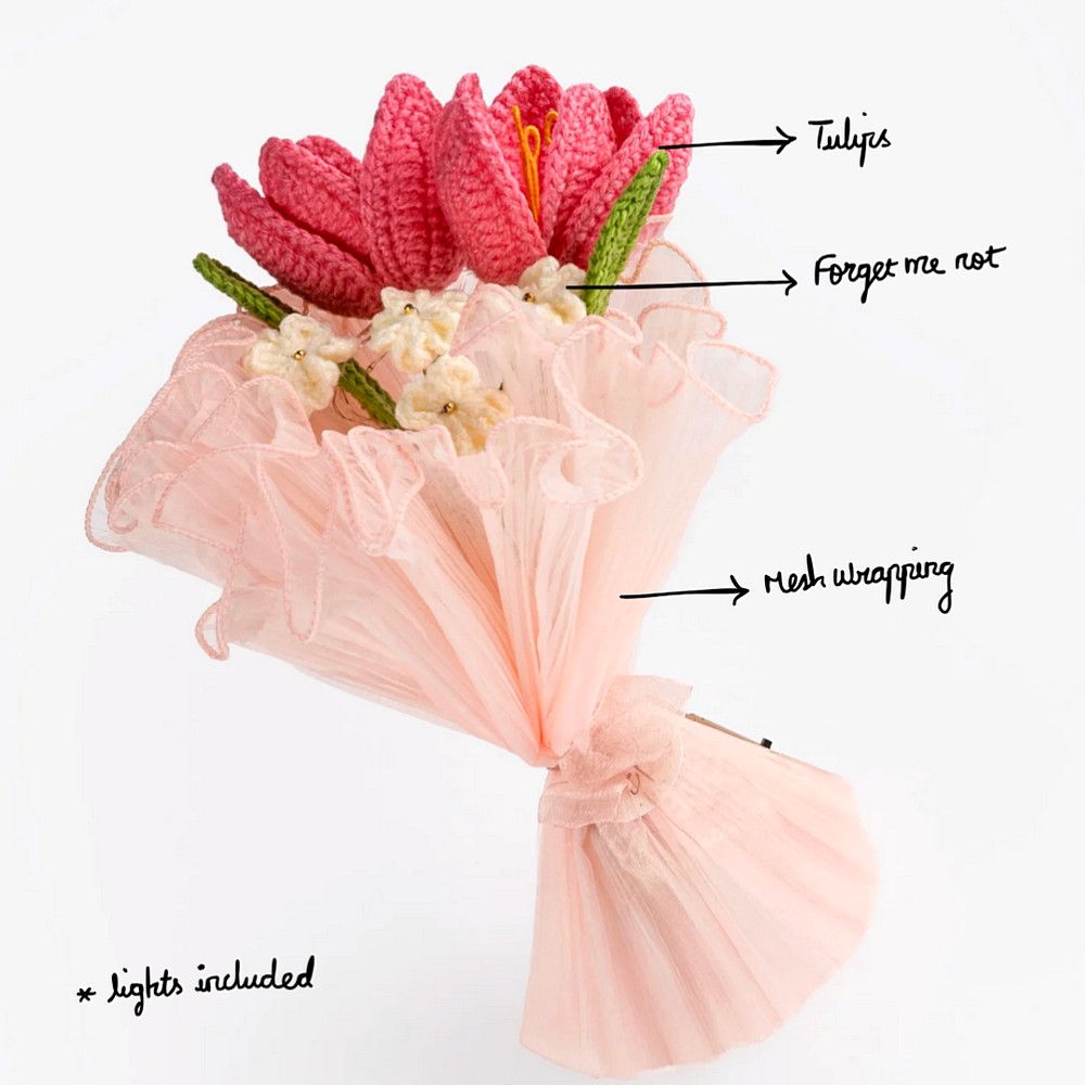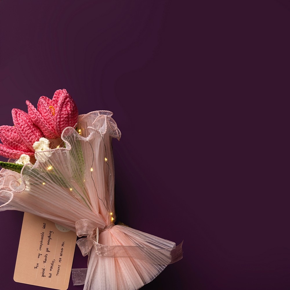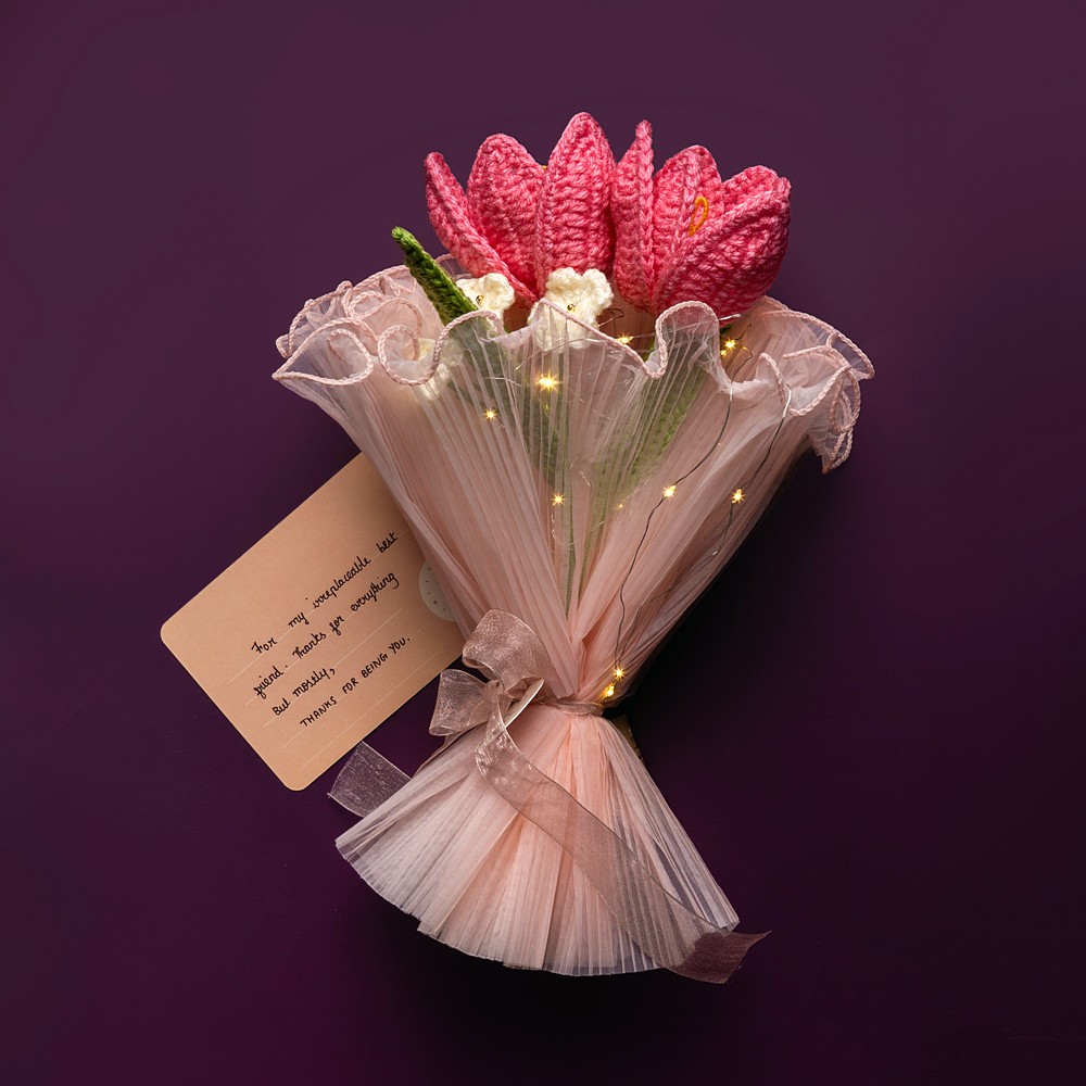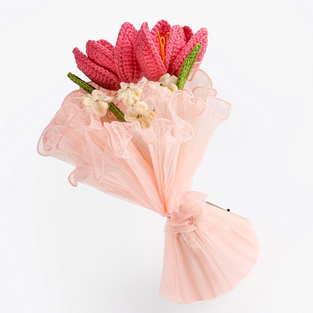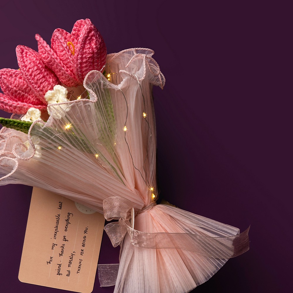 Keep your pink crochet piece away from moisture and direct sun to prevent dust and fading. Dust gently with a soft brush or a hairdryer on cool, and reshape stems carefully if needed.