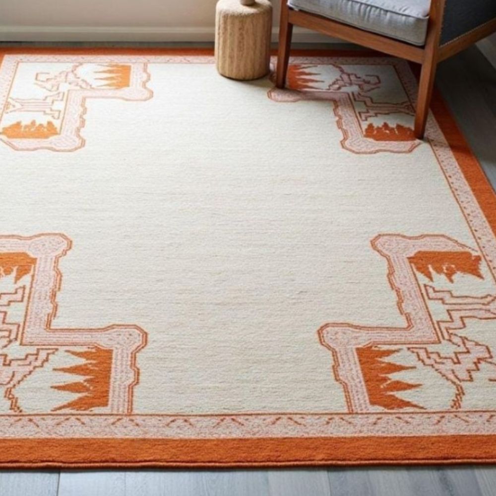 Design & Aesthetic This rug features a minimal yet traditional design, crafted with a soft cream base and accented with bold orange geometric motifs along the border. The clean center allows your furniture to stand out, while the border adds just the right amount of character to the space. Material & Quality Hand-Tufted in Premium Wool Ensures natural softness, warmth, and long-lasting durability. Comfort Underfoot Wool naturally provides a plush, comfortable feel, perfect for daily living. Eco-Friendly Wool is sustainable, biodegradable, and naturally flame-resistant. Pattern & Color Base Color: Neutral cream that brightens the space. Border Color: Rich orange, adding vibrancy without overpowering the room. Motifs: Geometric and abstract mountain-inspired shapes, blending tradition with contemporary minimalism. Versatility This rug fits seamlessly into multiple settings: Living rooms to create a welcoming, cozy vibe. Bedrooms for a warm, grounding touch. Study rooms or offices to add character without distraction. The high-quality wool ensures resilience against daily wear while maintaining its beauty for years. Customization Available We also offer custom sizes and colors to perfectly fit your space and design preferences. As it Appears Pack of One Piece.
