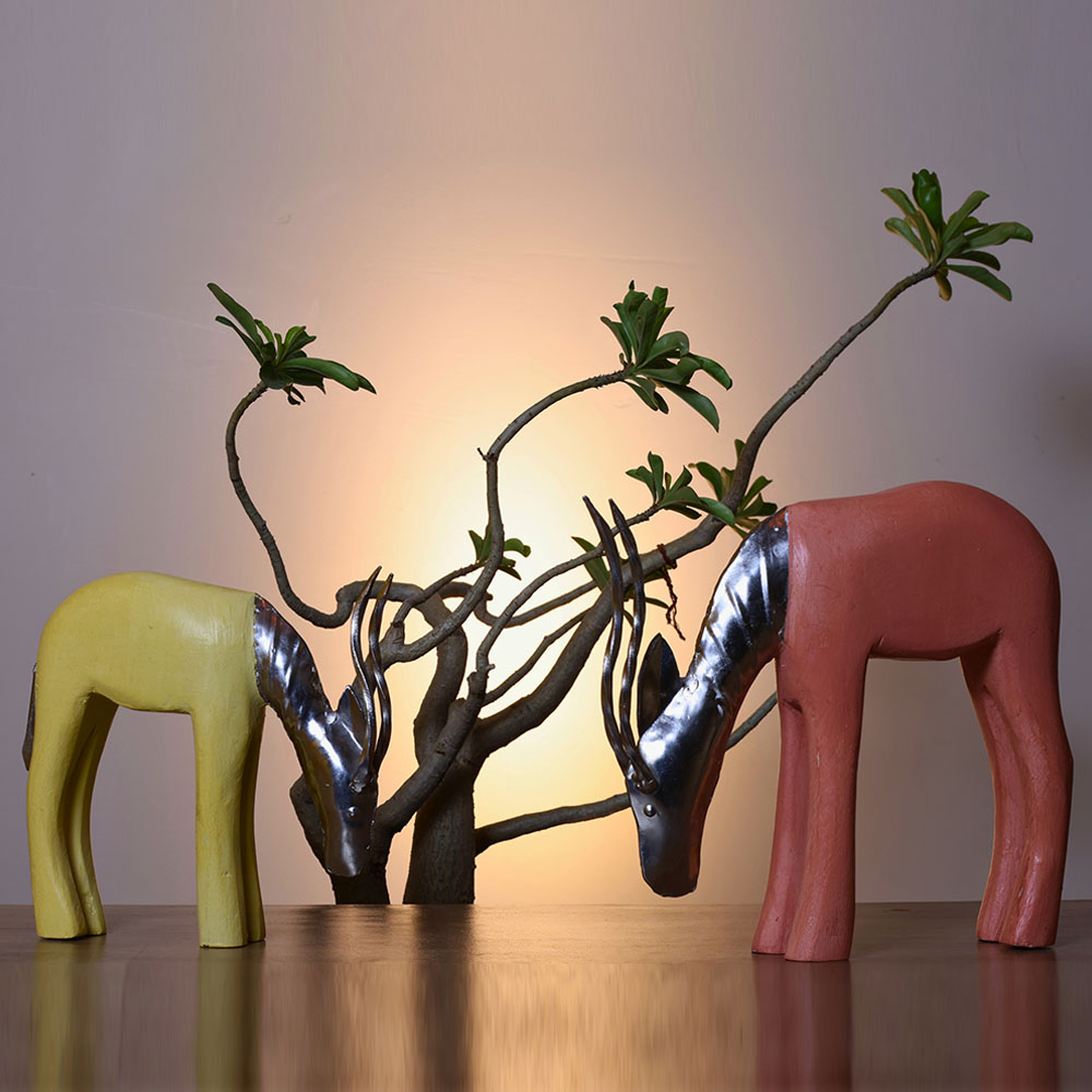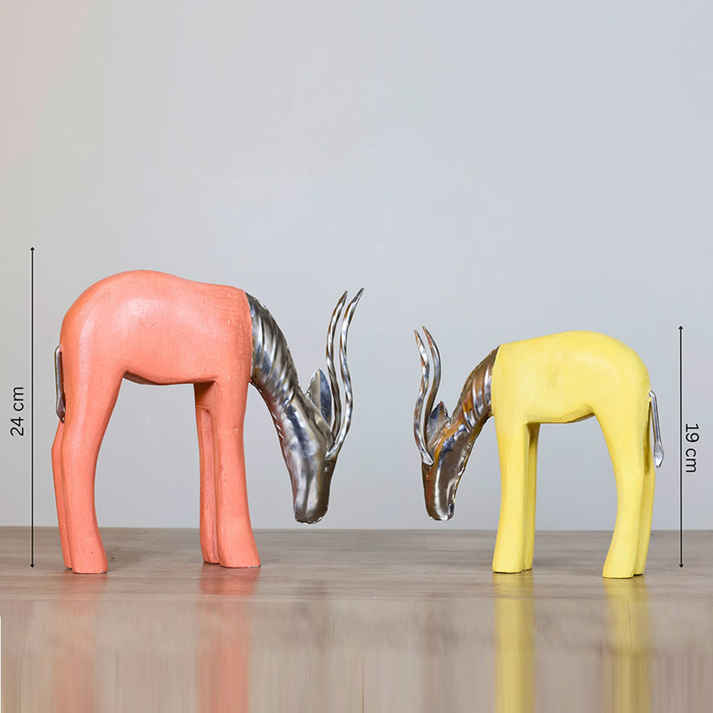 Hand-carved antelope sculptures evoke boho African art with sleek wooden bodies and metallic faces and horns. Painted in pastel sunshine yellow and coral peach, the pair brings warmth and sophistication to interior styling, perfect for collectors, gift-givers, or those seeking distinctive conversation pieces. Their unique form adds cultural flair. Packed & quality-checked by Indianshelf.