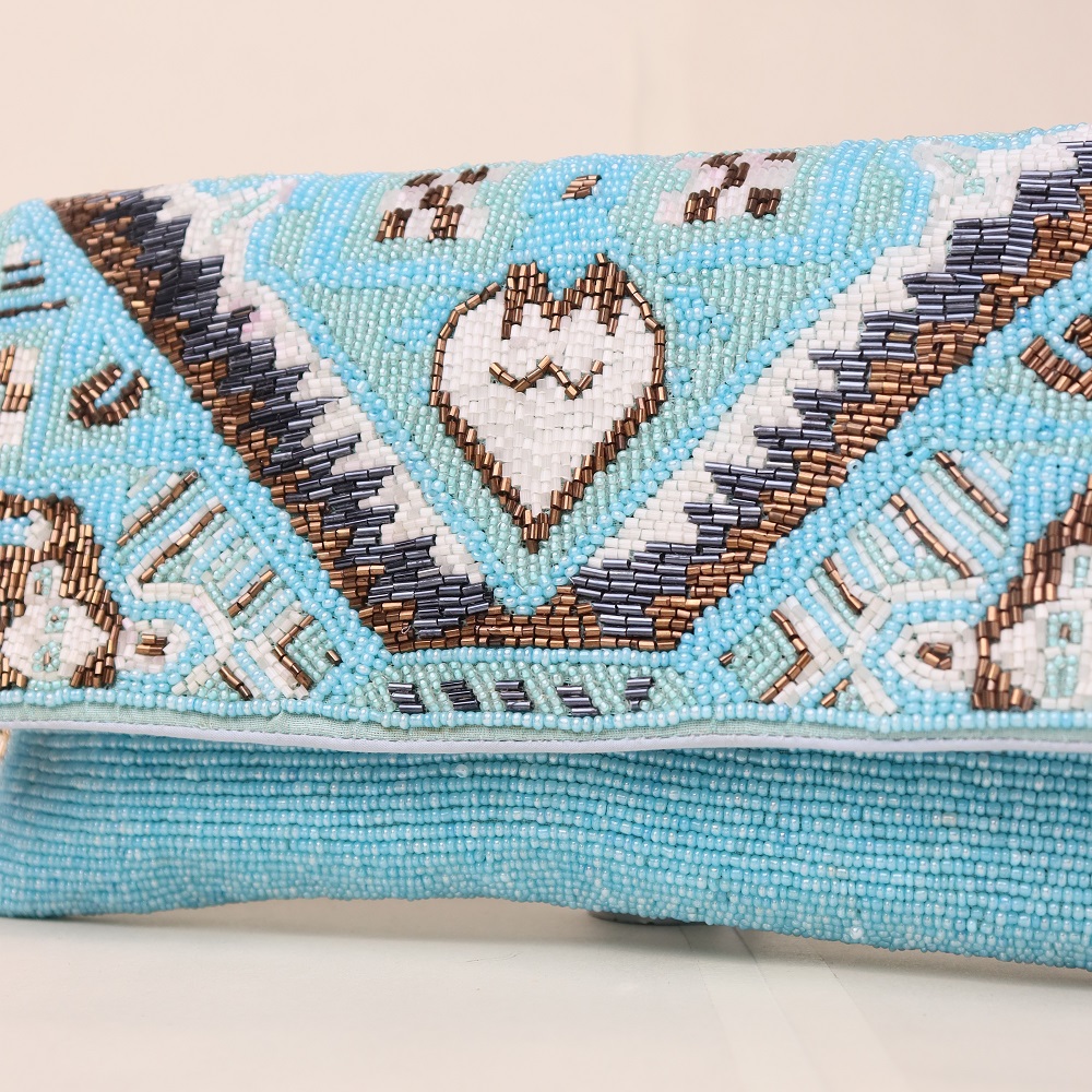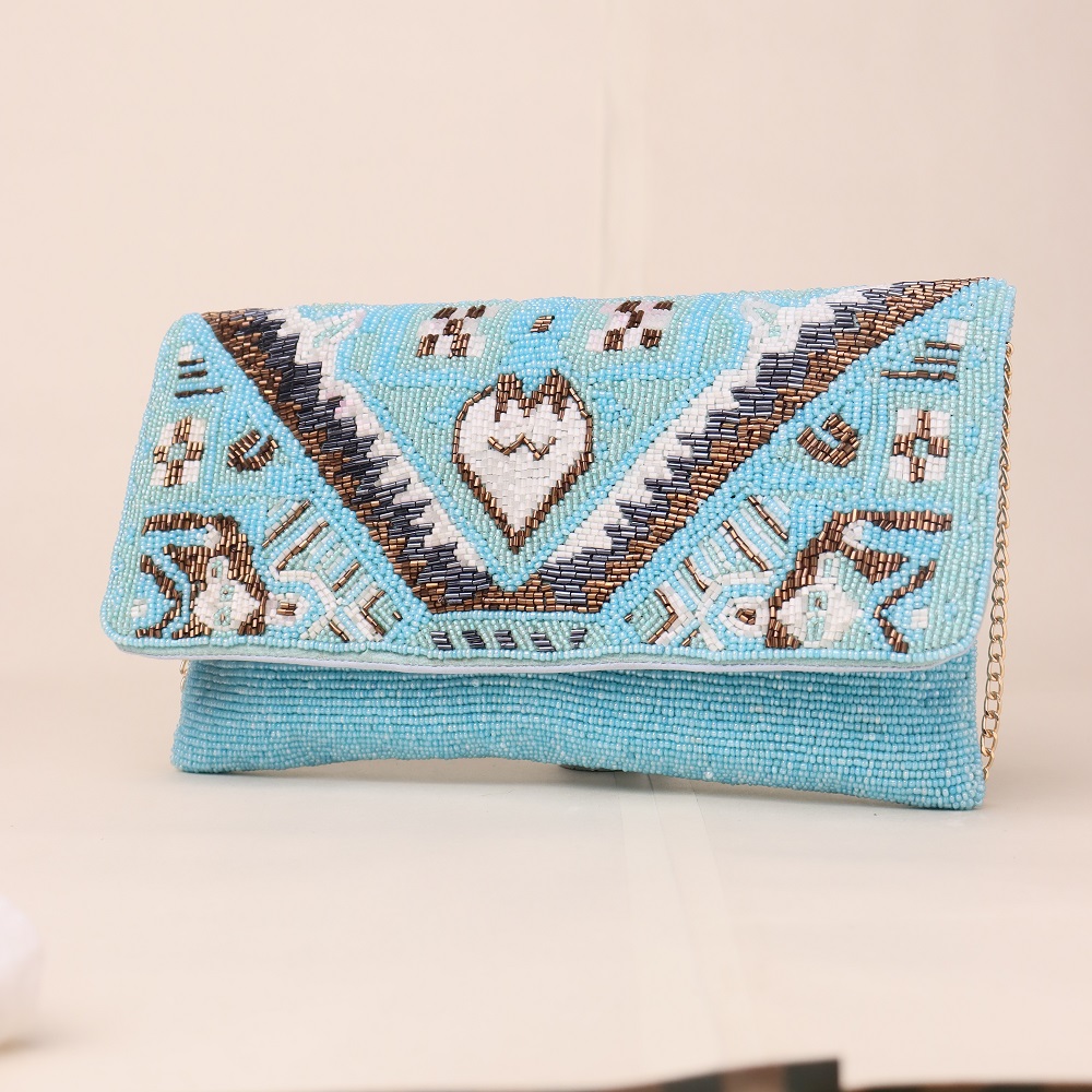 Step into effortless elegance with this handcrafted boho-style clutch, adorned with intricate tribal motifs in a vibrant beadwork layout. The detailed geometric heart and border accents evoke artisanal charm, while the structured silhouette ensures it’s as practical as it is eye-catching. A gold chain strap adds functionality, giving you the freedom to carry it as a sling or a handheld clutch depending on the occasion.