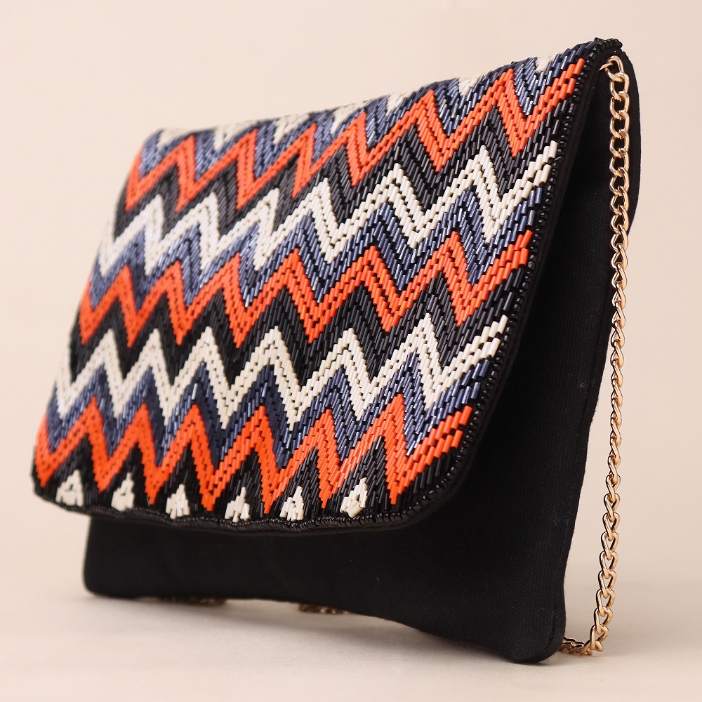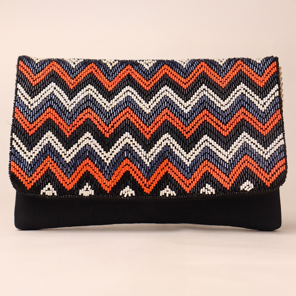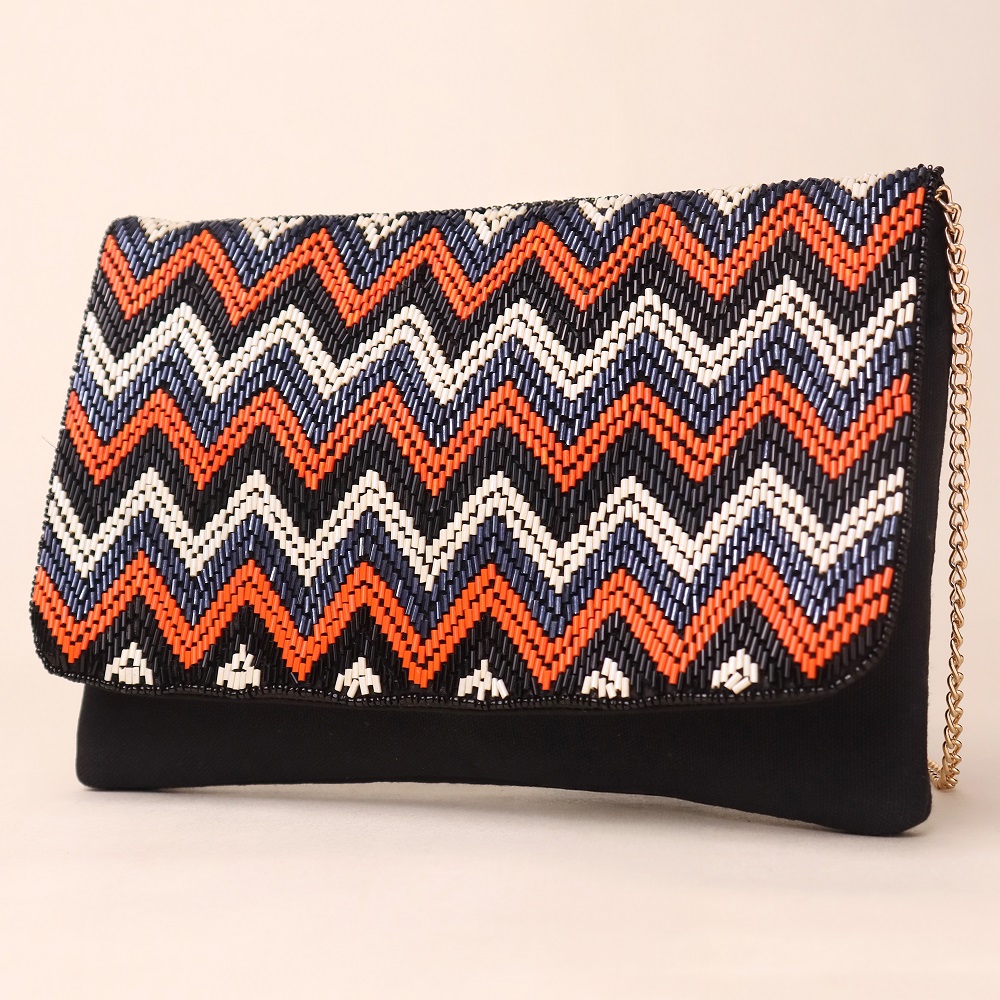 Make a bold style statement with this handcrafted zigzag-patterned clutch, a blend of tribal flair and modern elegance. Its striking chevron beadwork is complemented by clean lines and a soft finish, offering a perfect mix of texture and pattern. Whether worn as a sling with its sleek chain strap or carried as a clutch, this accessory effortlessly elevates any ensemble.