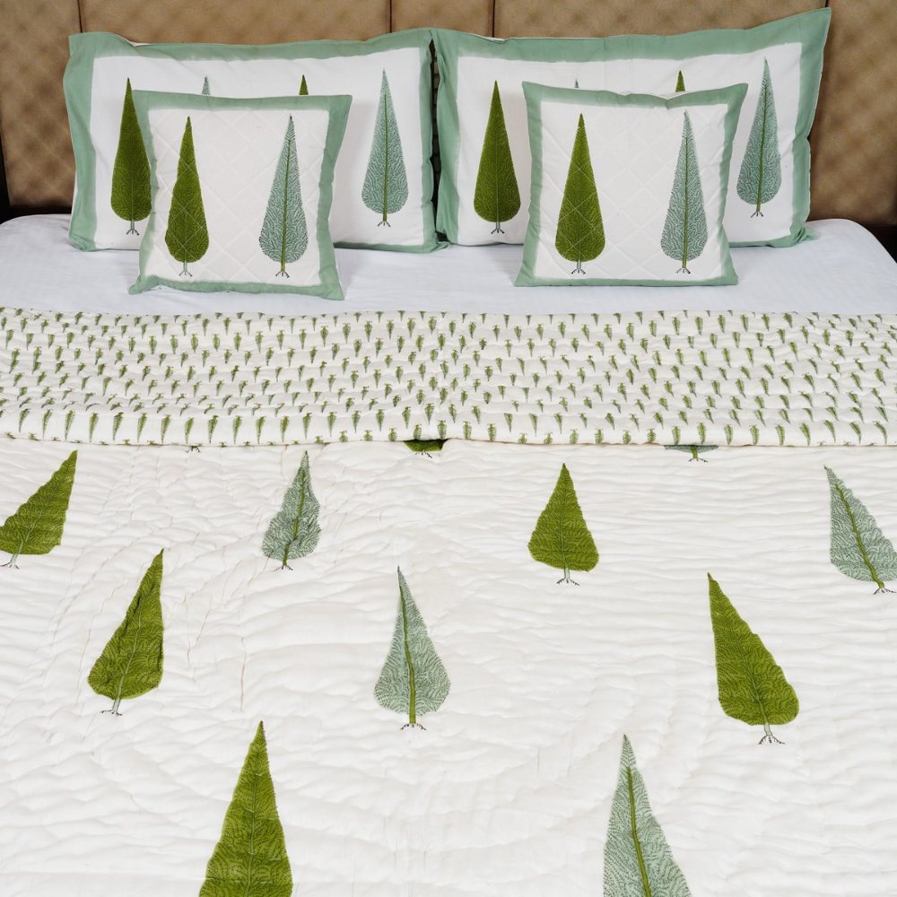 - Decorated with hand-block printed leaf patterns in soothing green shades