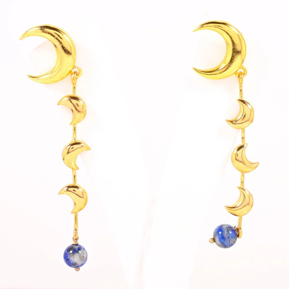 The Brass 18K Gold Plated Crescent Moon Dangle Earrings with Lapis Gemstone are a poetic blend of celestial symbolism and artisan craftsmanship. Handcrafted in brass and finished with luminous 18K gold plating, these earrings feature an elegant crescent moon silhouette paired with rich lapis gemstones. The deep blue tones create a striking contrast against warm gold, offering graceful movement and visual depth. Designed as statement gift jewelry, they feel expressive, refined, and timeless.