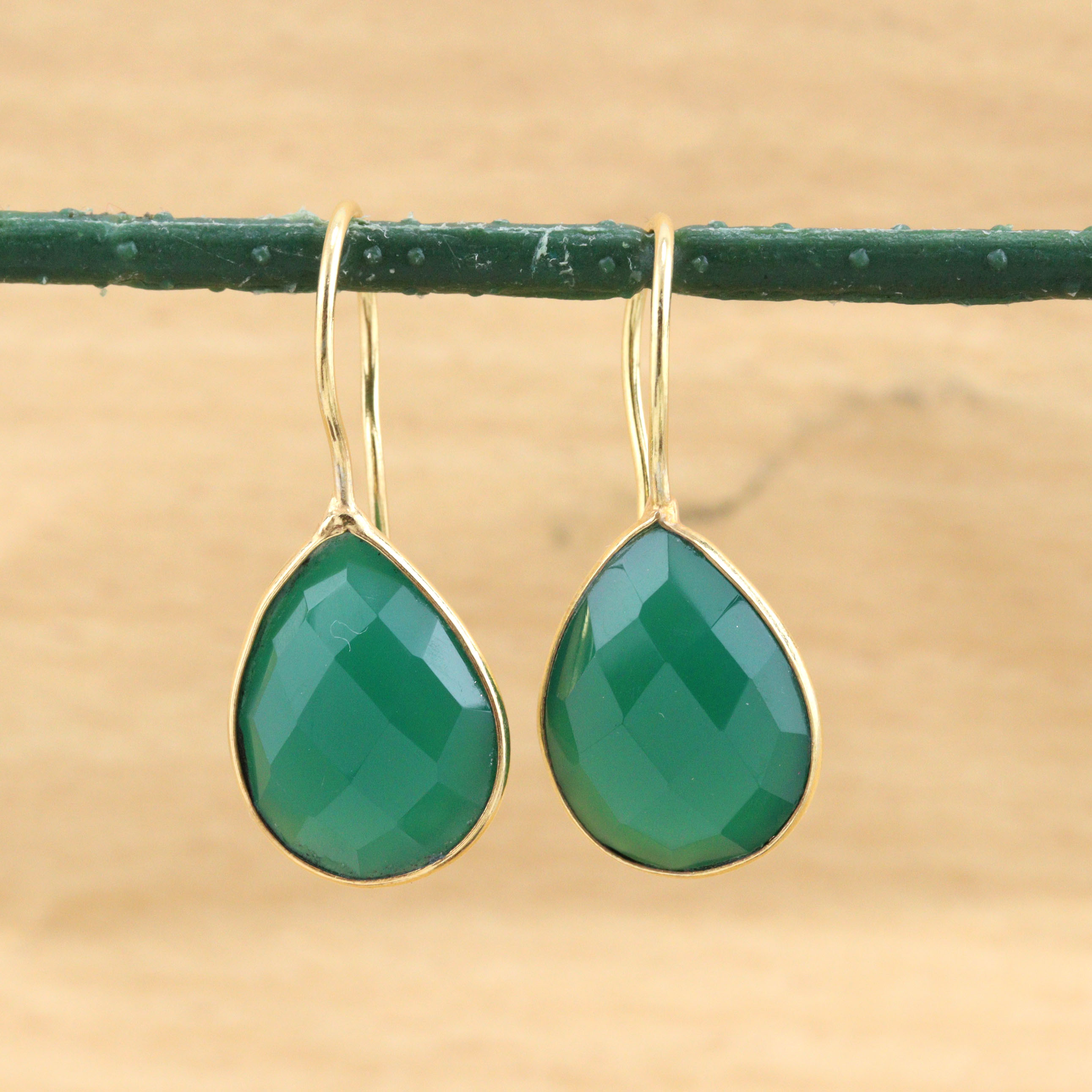 These Brass 22K Gold Plated Dangle Earrings with Green Onyx Gemstone are a perfect blend of timeless luxury and artisanal grace. Each earring is handcrafted with precision, featuring genuine green onyx set in warm 22K gold-plated brass. The soothing green hue symbolizes harmony and vitality, while the intricate gold polish adds a touch of sophistication. Designed for modern women who cherish traditional artistry with contemporary flair, these earrings bring luminous charm to every occasion.
