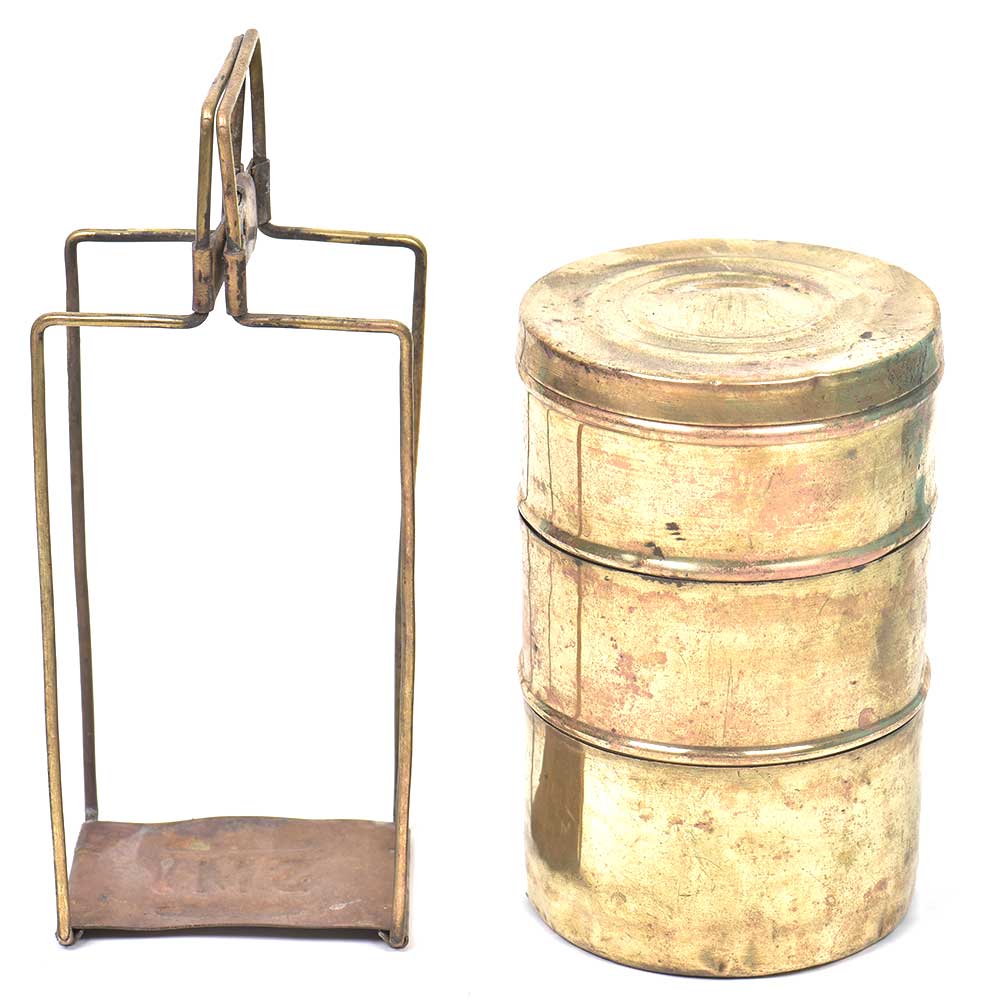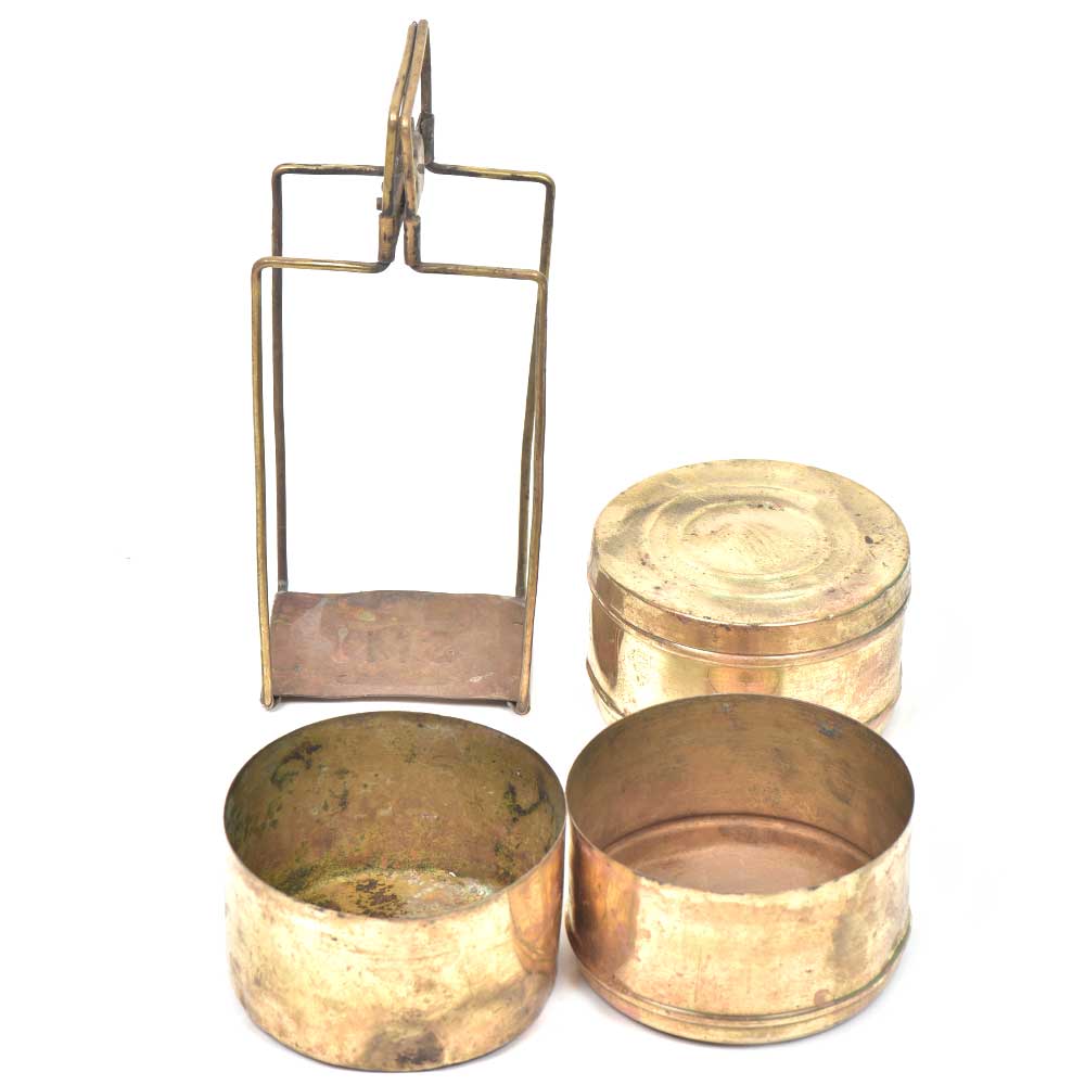 Vintage style brass tiffin box is a three tier lunch box that has three containers fill each container with fruit, salad, sandwiches, veggies & snacks. stack the containers on top of each other and close the clasp. the 3-tier round design is perfect for snacks, commuters, picnics and camping.
