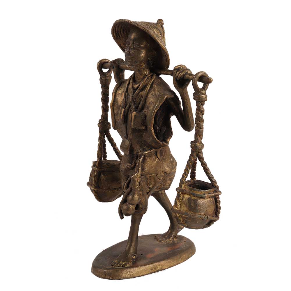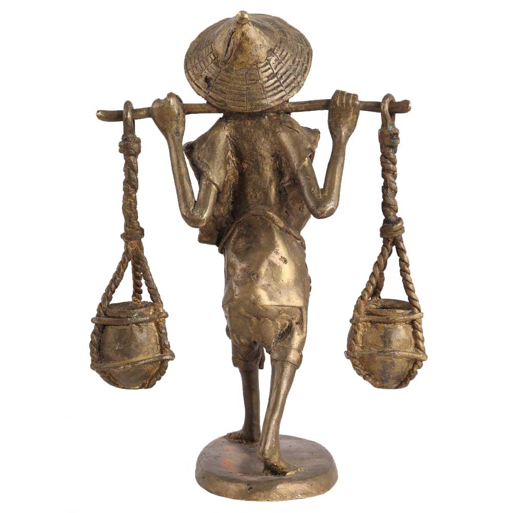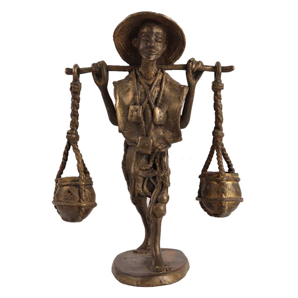 This brass showpiece depicts an African man carrying water. Popular as a classic rural water carrier figure With a desirable aged patina. The brass figurine exhibits excellent weathering and dark, natural hues . The man walks with a pair of large buckets in a wide yoke. His face is a cheerful sight as he wears a jaunty hat and his long flowing robe billows over his slender frame. Standing on a circular base with a foliate pattern around the perimeter. This is a lovely antique decorative figure with beautiful rural African imagery.