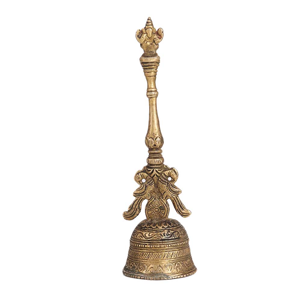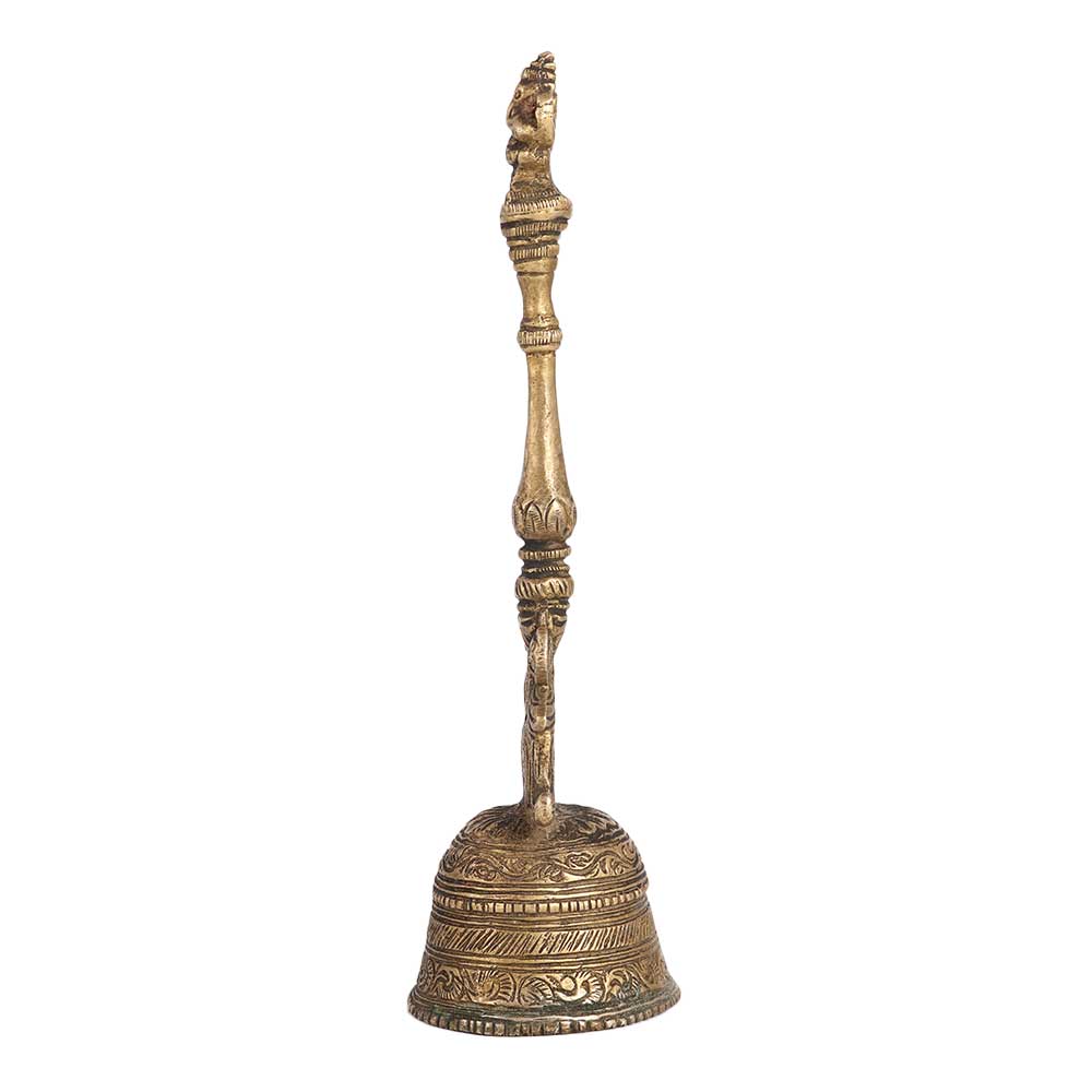 A vintage bell used in temples during morning and evening prayers to produce a soothing sound that relaxes the believer's mind and helps him focus on the deity. It is made of high quality brass and engraved with a beautiful design that makes it an eye-catcher for your visitors and guests. This bell is carved with the statue of Lord Ganesha on the top. Lord Ganesha is one of the most important deities in Hinduism and is worshipped before the beginning of new venture. You can use this auspicious temple bell during havan, pooja, ritual or in the temple during prayers. A brass bell as a gift on special and festive occasions for your loved ones.