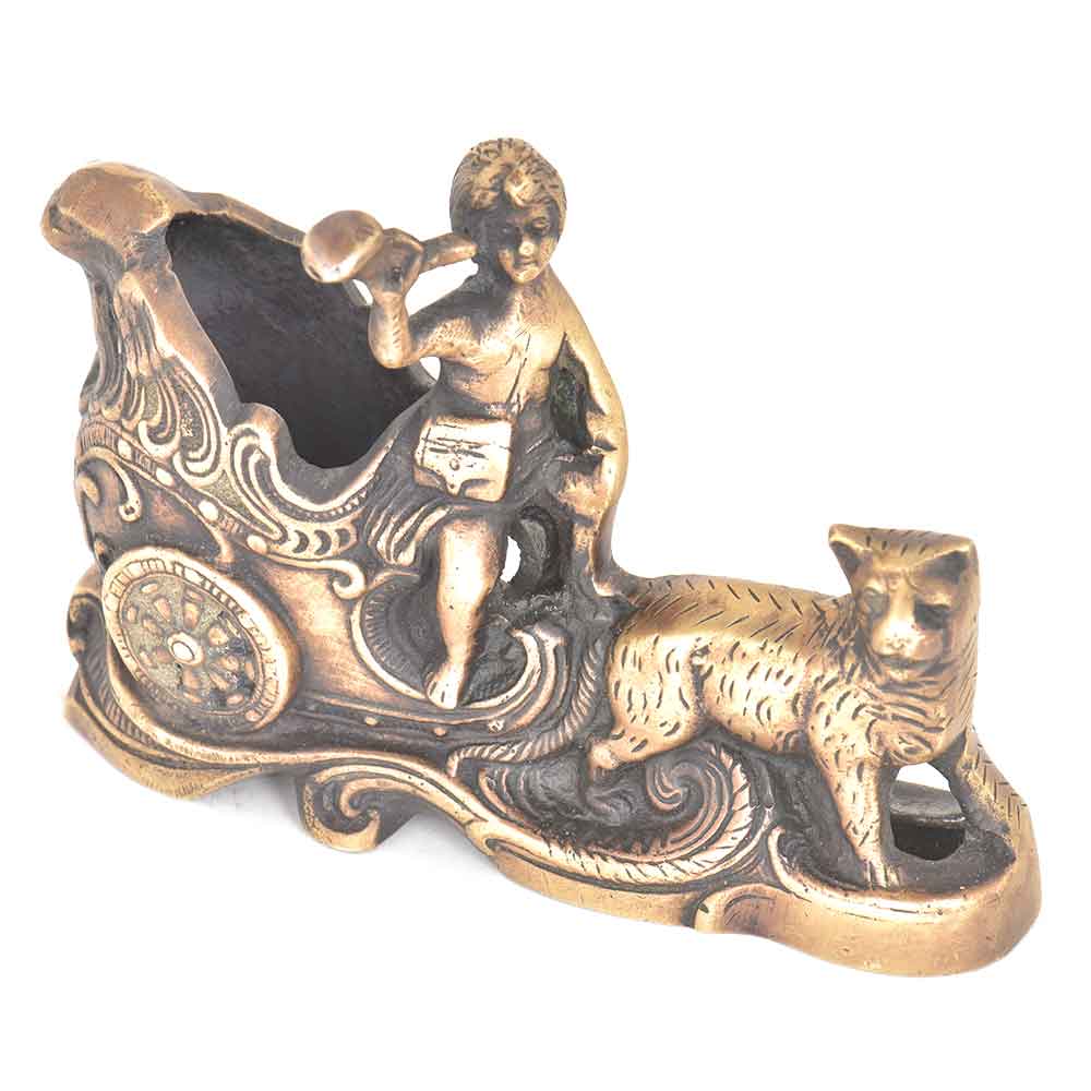 Handmade brass vintage carriage statue drawn by big cat which depicts that it is the property of the royal family a man is seen seated on the carriage making some kind of announcement with a loudspeaker in his hand with lovely engraved design on the carriage . Can be used as a pen holder, for gifting or a study table decor item.
