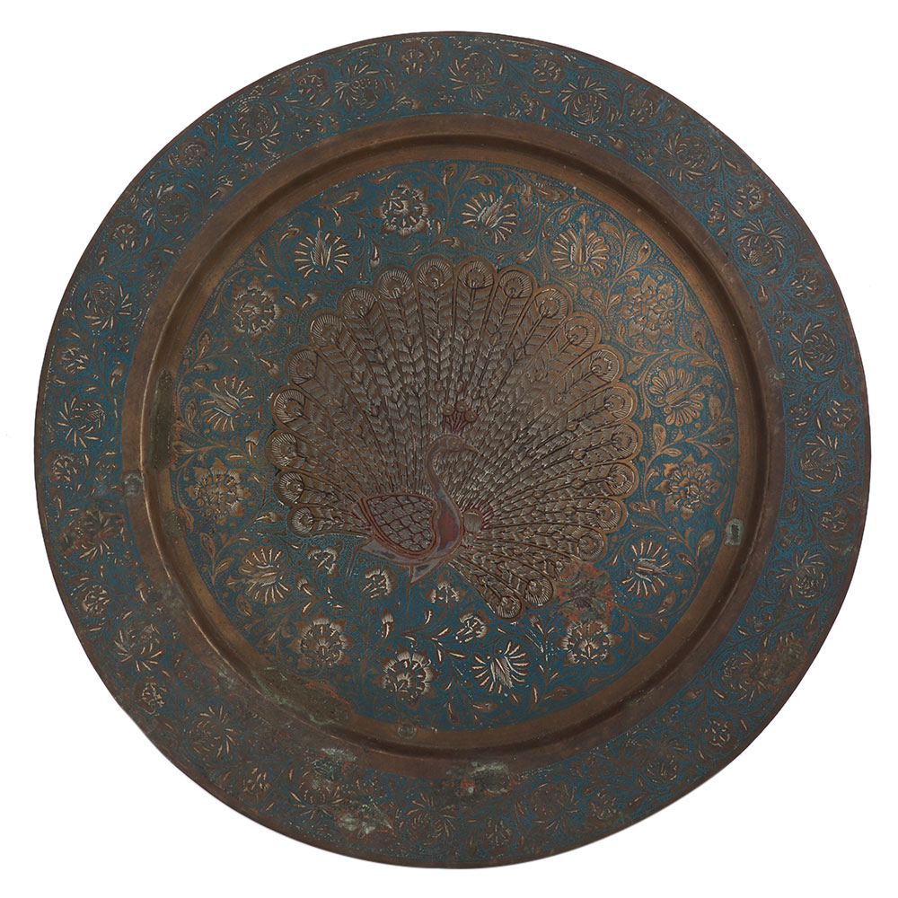 Brass Blue Painted Peacock Enameled Wall Plate is used as a Tray Table or Wall Hanging Artwork. Finely Hand-Hammered and Chiseled with Floral , Leafy Designs and Peacock bird engraved on the Blue Painted Plate.